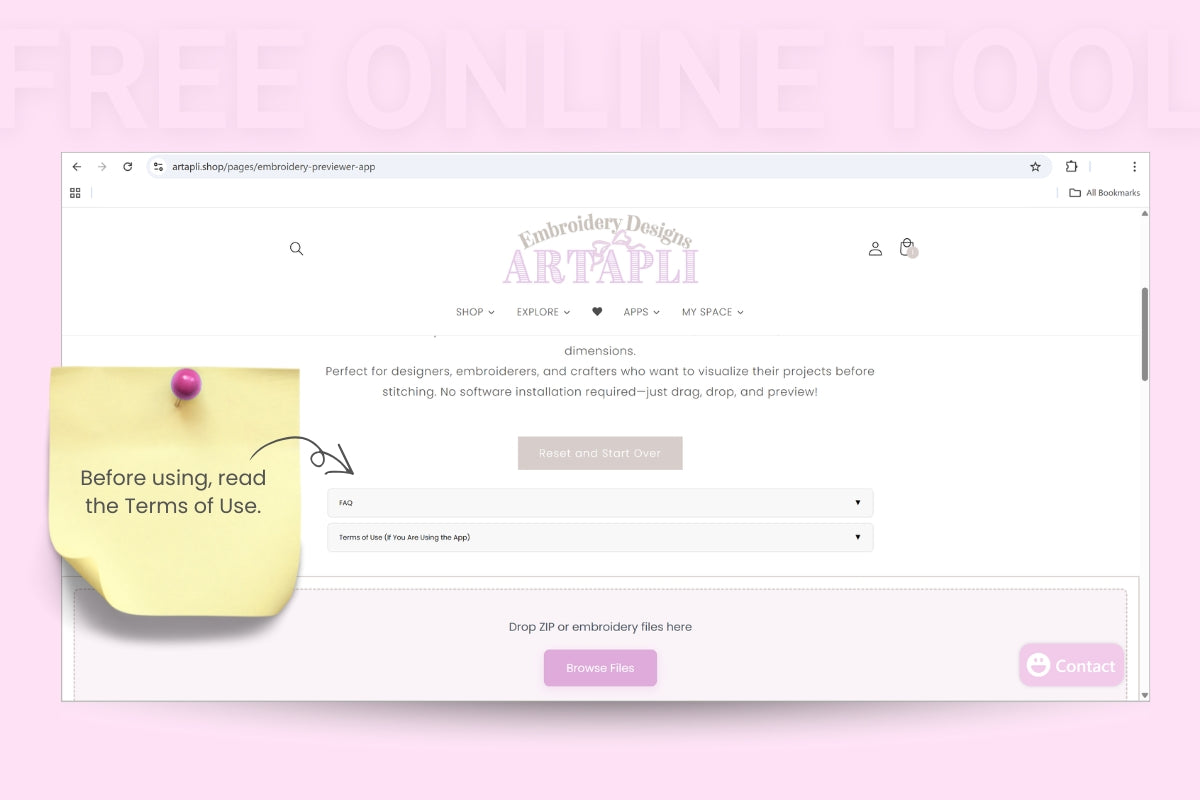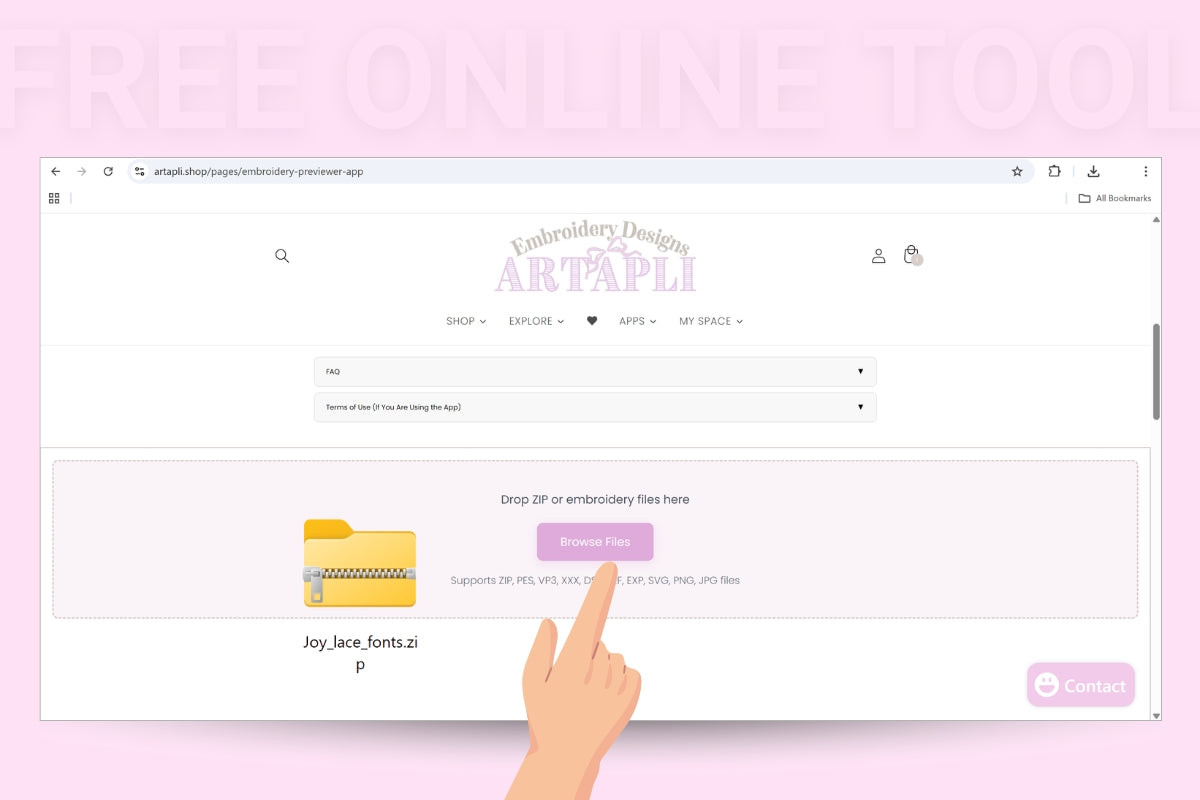 Drop or upload an embroidery file or ZIP from your computer using the pink Browse button.