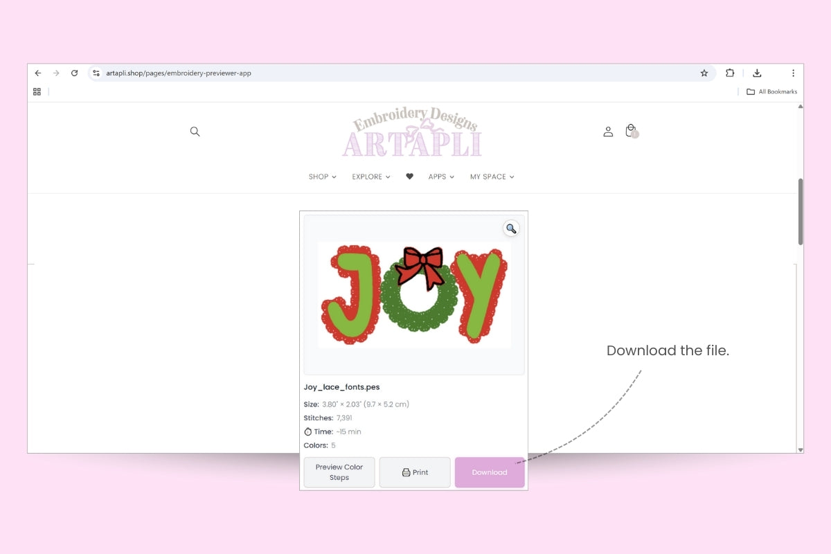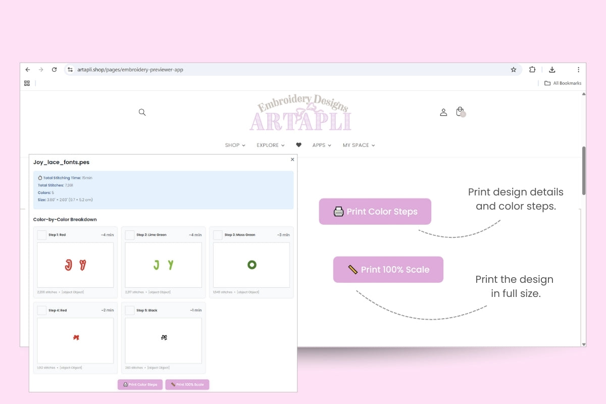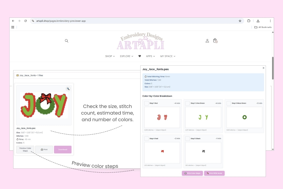 Please check the size, stitch count, estimated time, and number of colors, and preview the color steps.