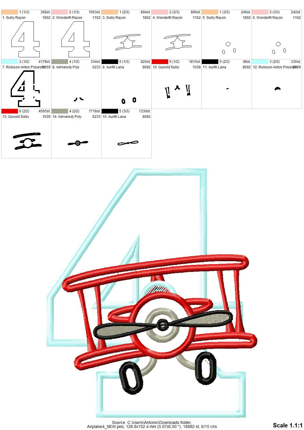Airplane Birthday number FOUR 4 Applique machine embroidery designs kids boy baby Birthday outfit hoop 4x4, 5x7, 6x10 vehicle plane number