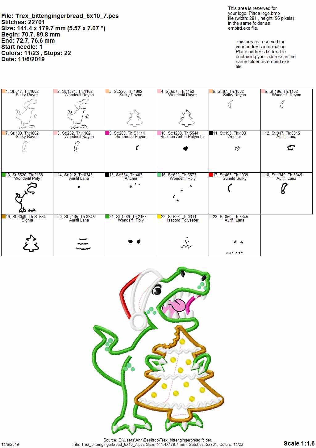 Bitten Christmas tree gingerbread and T-rex Christmas dinosaur Santa hat machine applique designs assorted sizes, for hoops 4x4, 5x7, 6x10