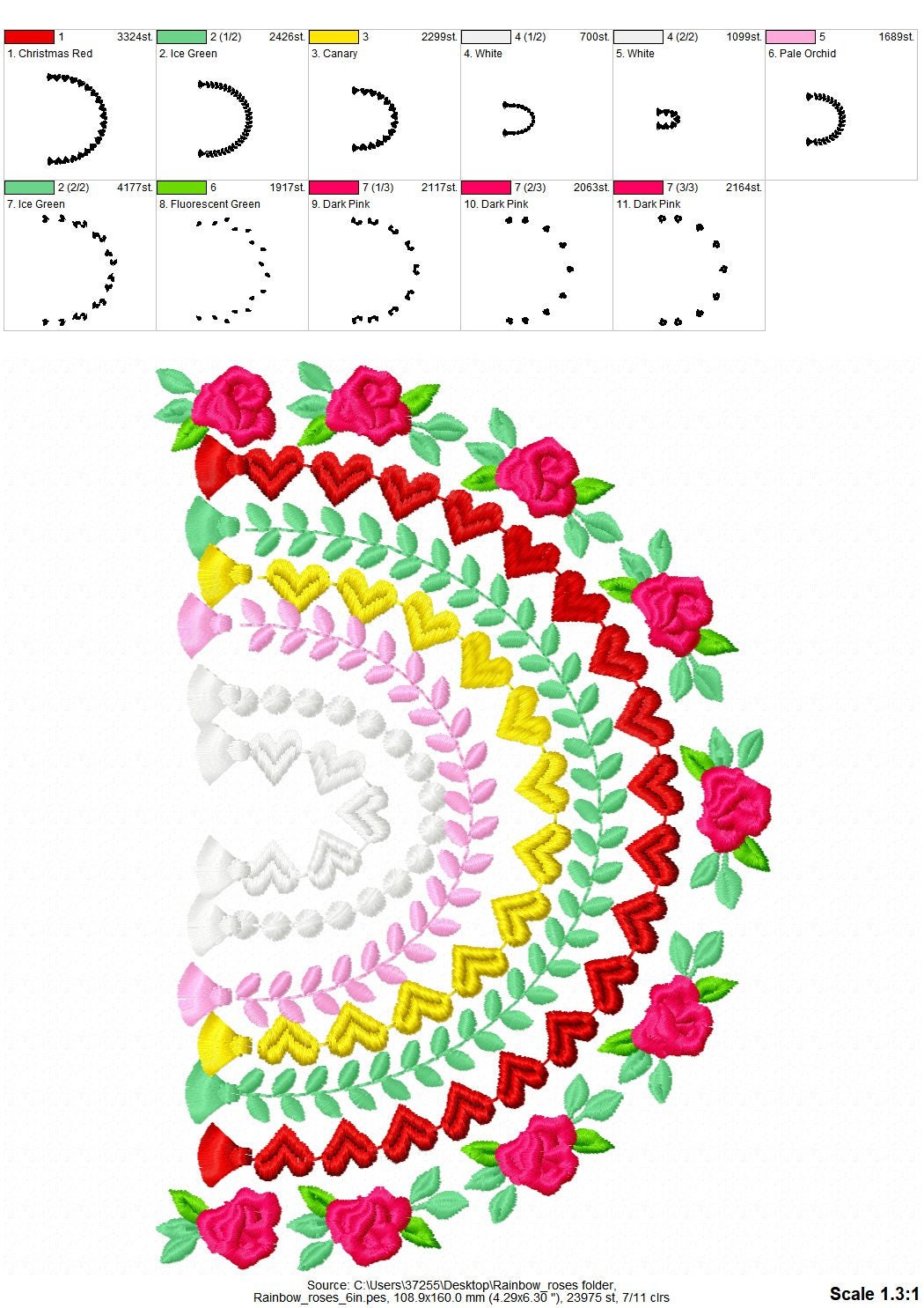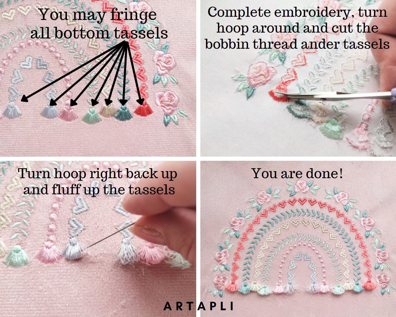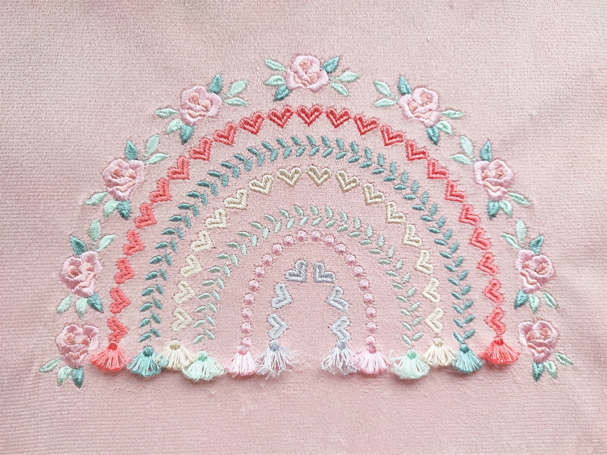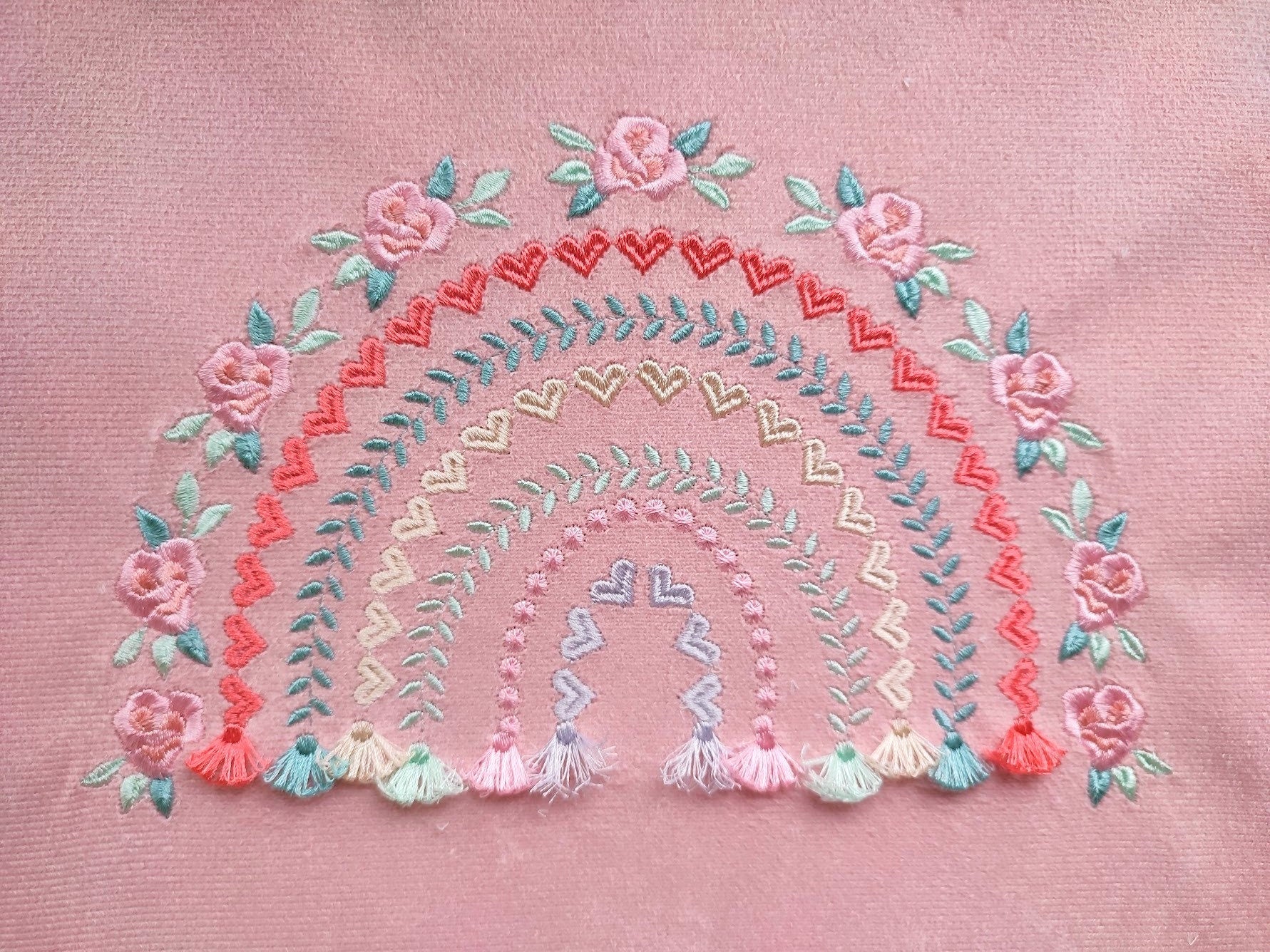 Boho floral rose and heart Rainbow fringed tassels machine embroidery designs in assorted sizes, girly pretty rainbow heart flower tassels