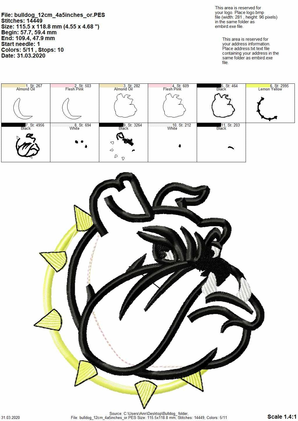 Bulldog mascot - machine embroidery applique and fill stitch designs INSTANT DOWNLOAD