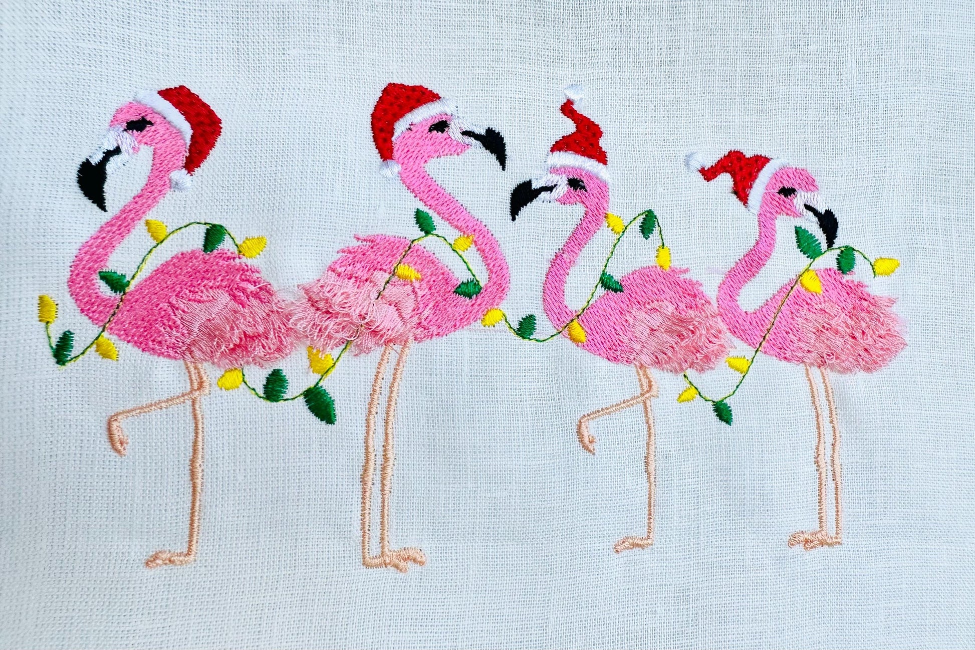 Christmas Flamingoes row Fluffy bird Santa hat Fringed Flamingo in the row machine embroidery designs kids sweater outfit hoodie design