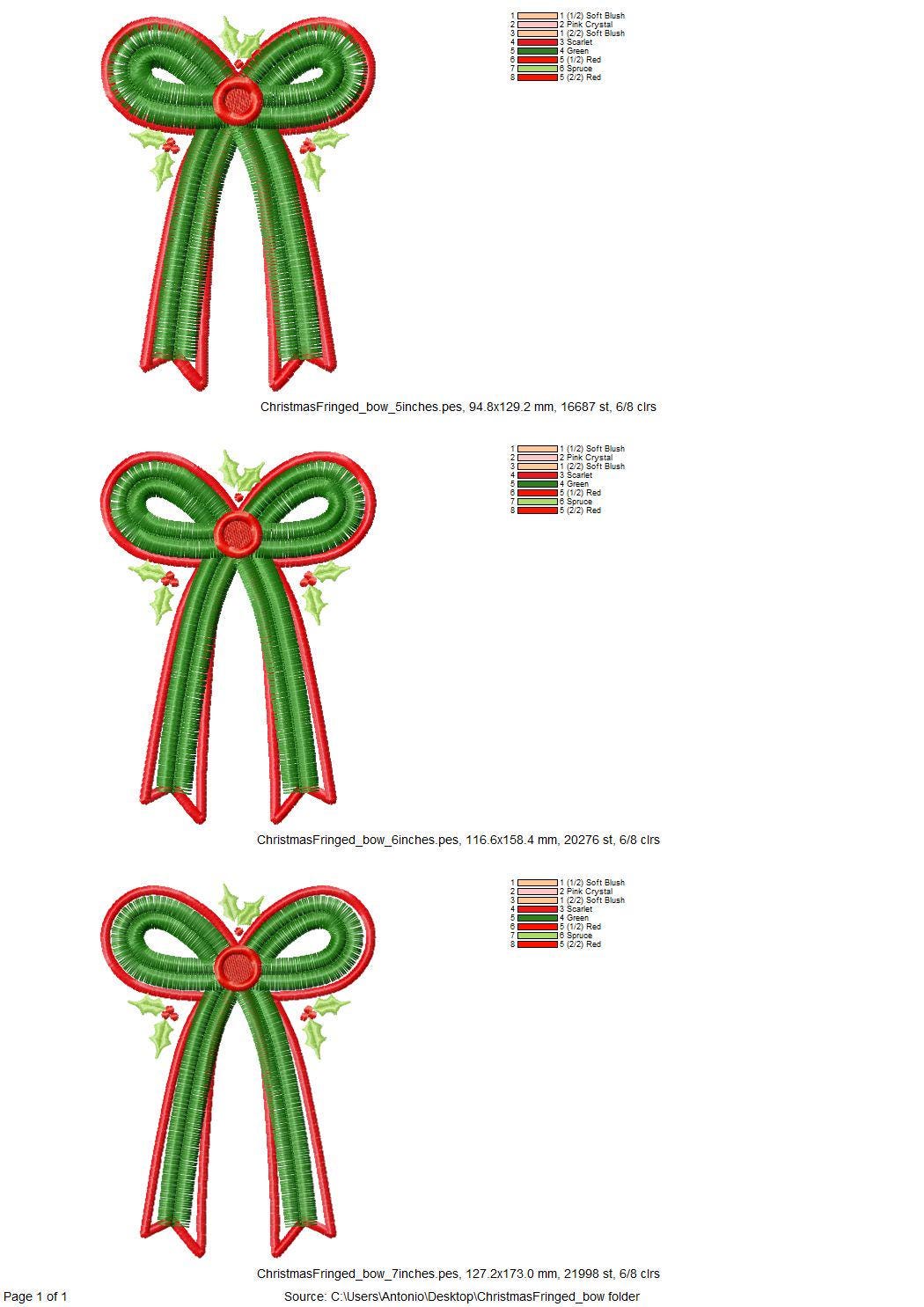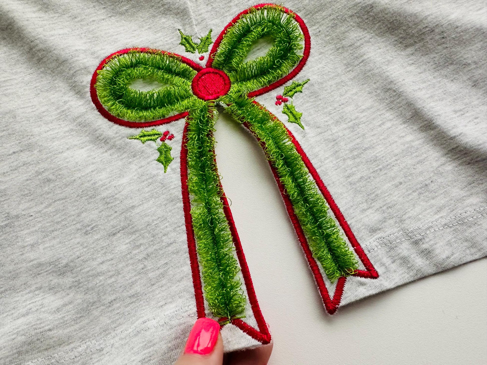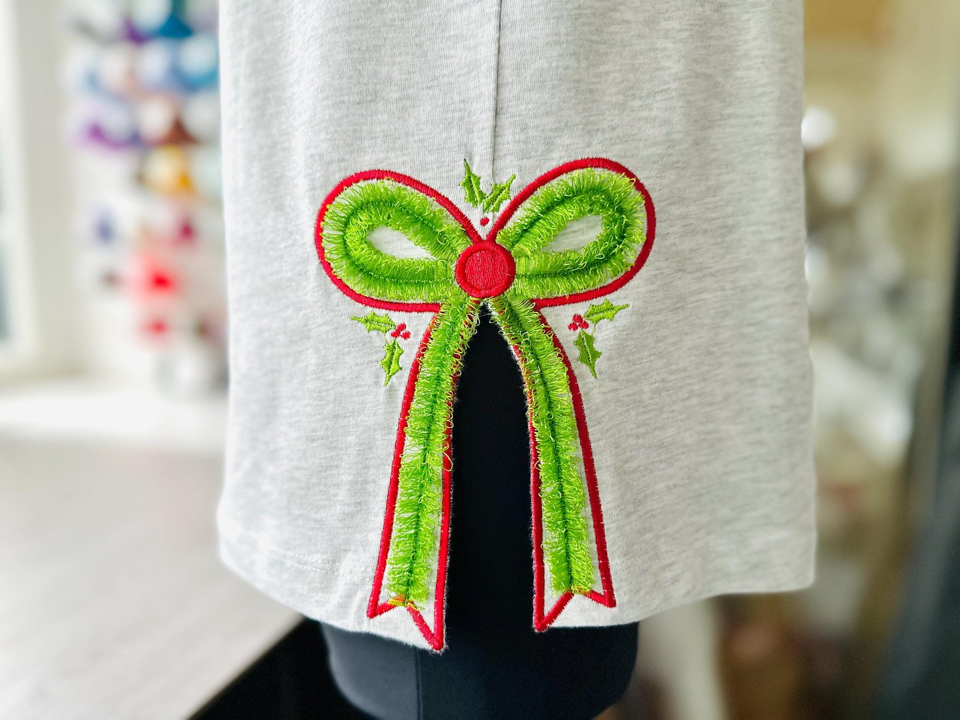 Christmas Fringed fluffy Bow Holly Berries accent split seam cutout Side Bow Applique machine embroidery designs Sweatshirt T-shirt design