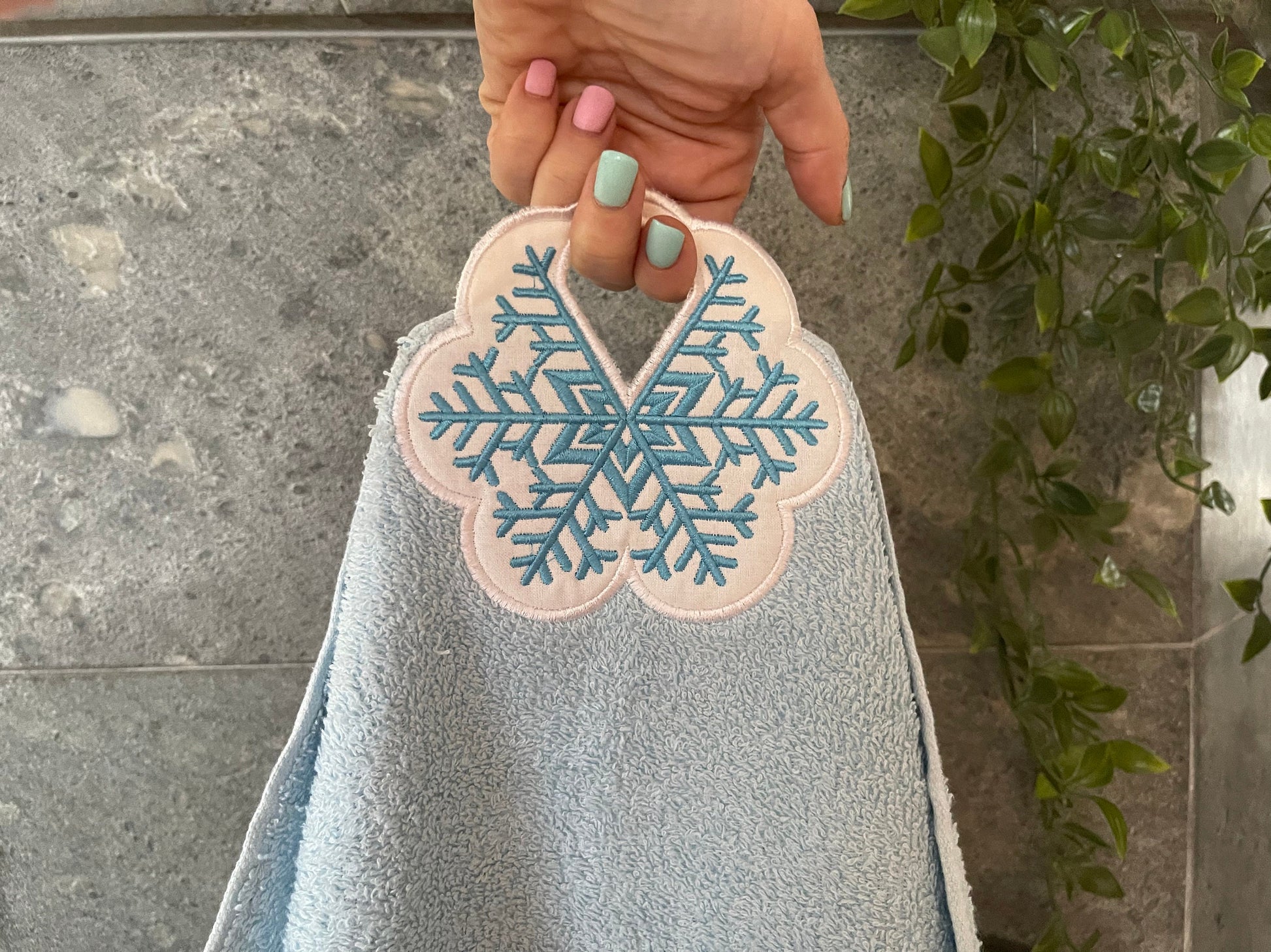 Christmas snowflake frozen bath towel topper hanging hole In The Hoop machine embroidery designs, ITH project towel hanger kids gift idea ITH project machine embroidery design