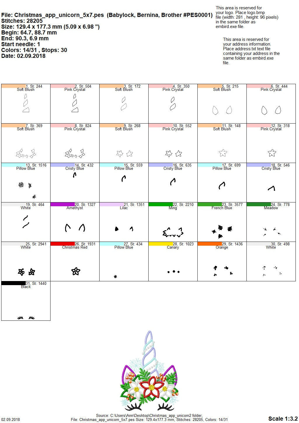 Color charts: PDF or image file with thread colors, stitch order, and counts