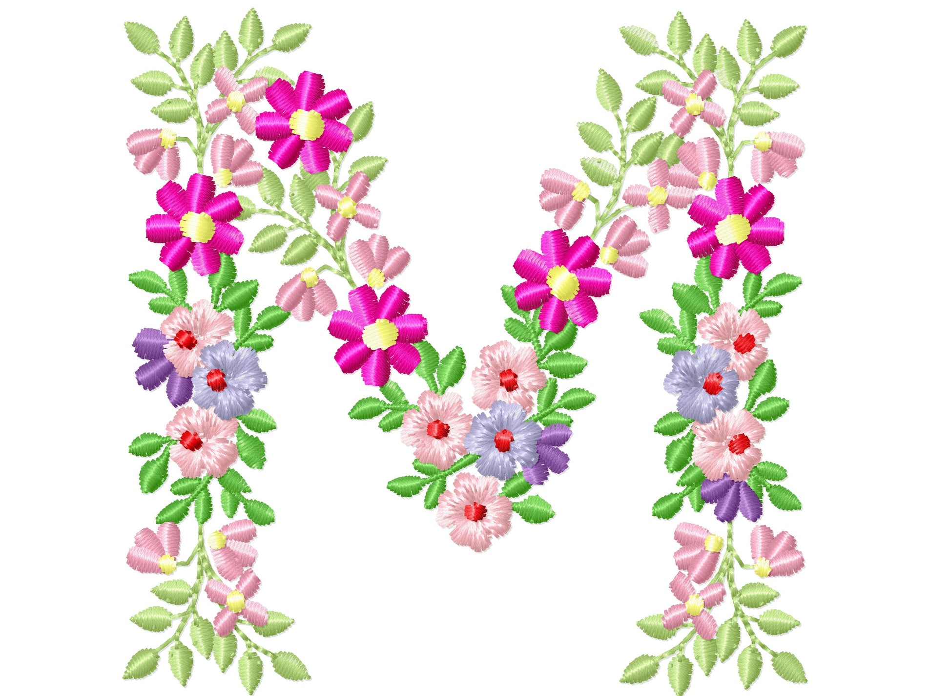 Country Floral Letter M, Garden Flag, Monogram Flower Flowered Machine Embroidery Design, Monogram M