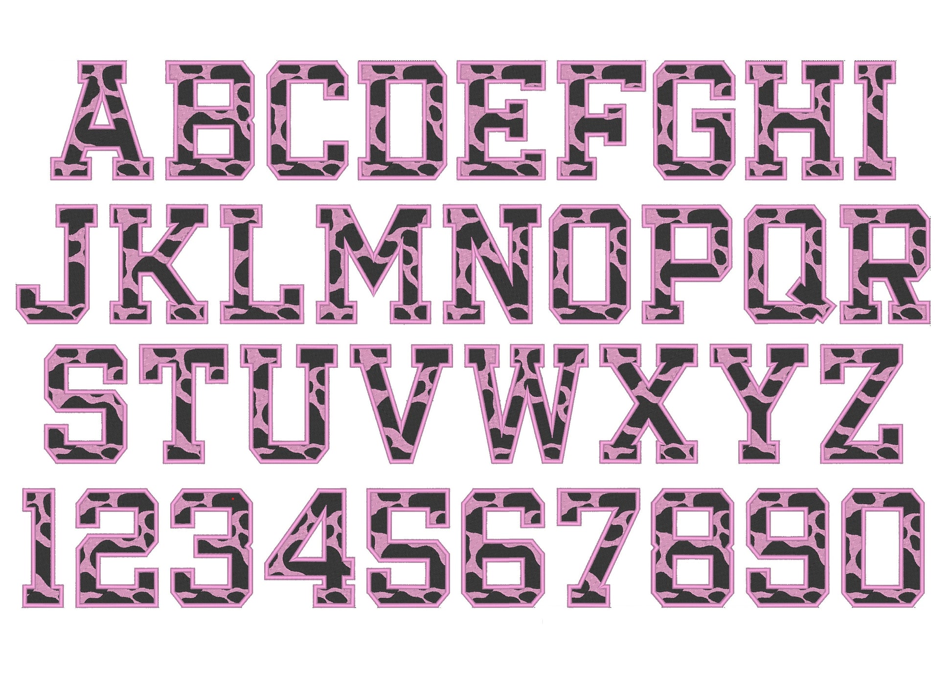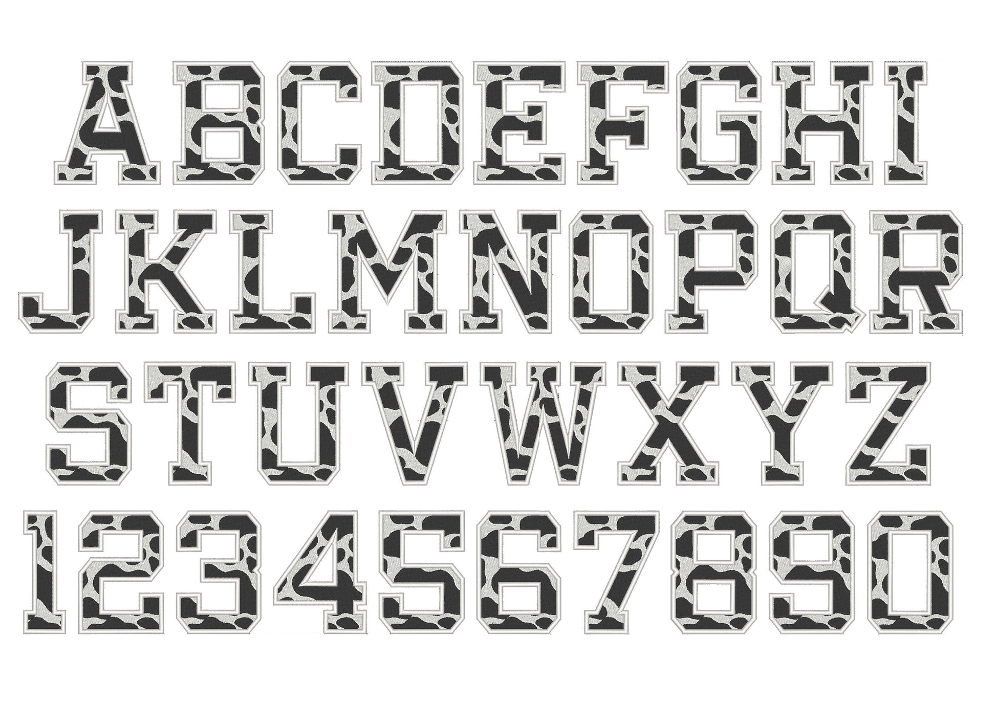 Cow print block Font fill stitch alphabet letters machine embroidery design uppercase and numbers BX include Cow spots monogram name font
