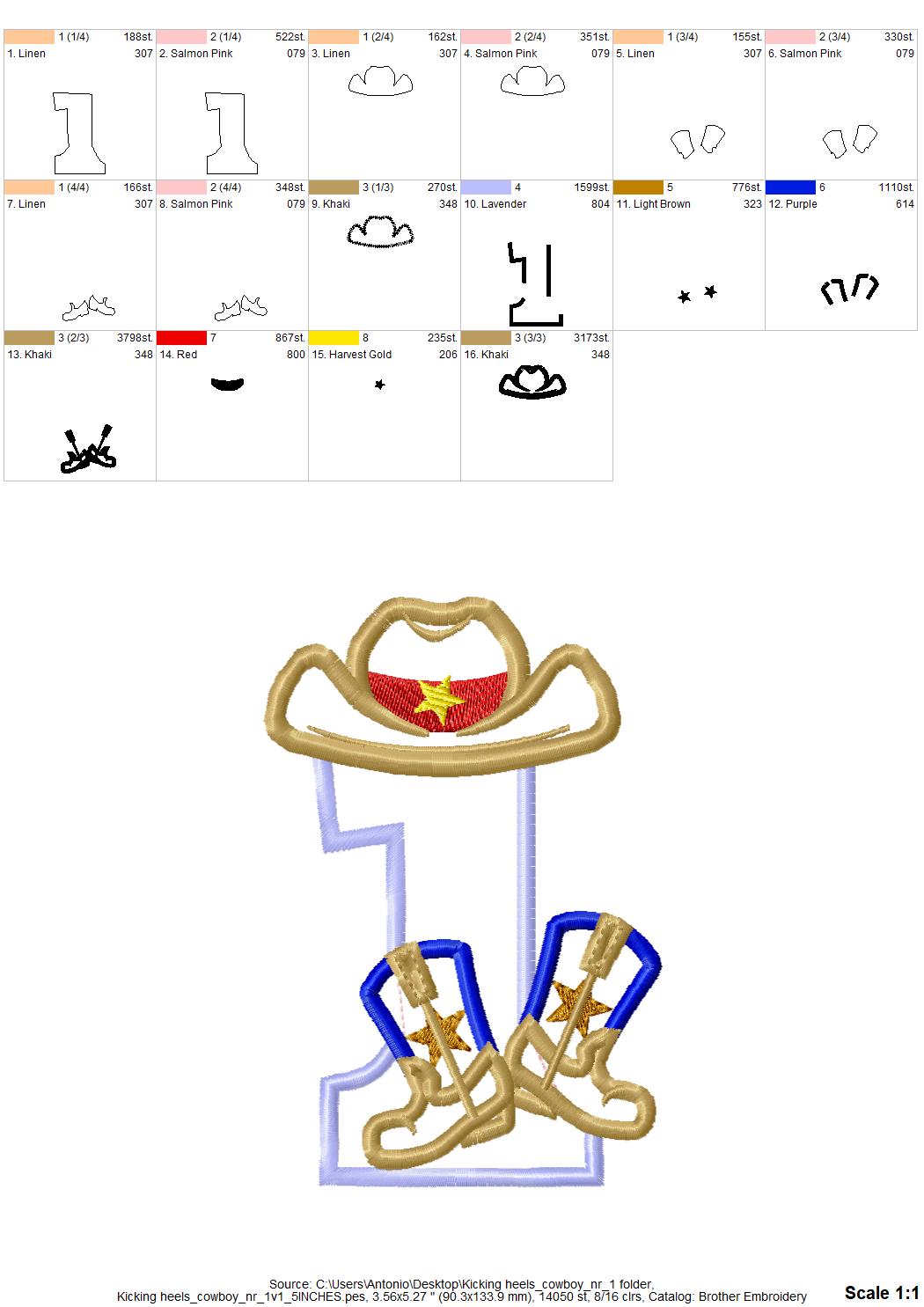 Cowboy Birthday number ONE 1 kicking boots number 1 machine embroidery applique designs for hoop 5x7, sizes 5 and 6 inches