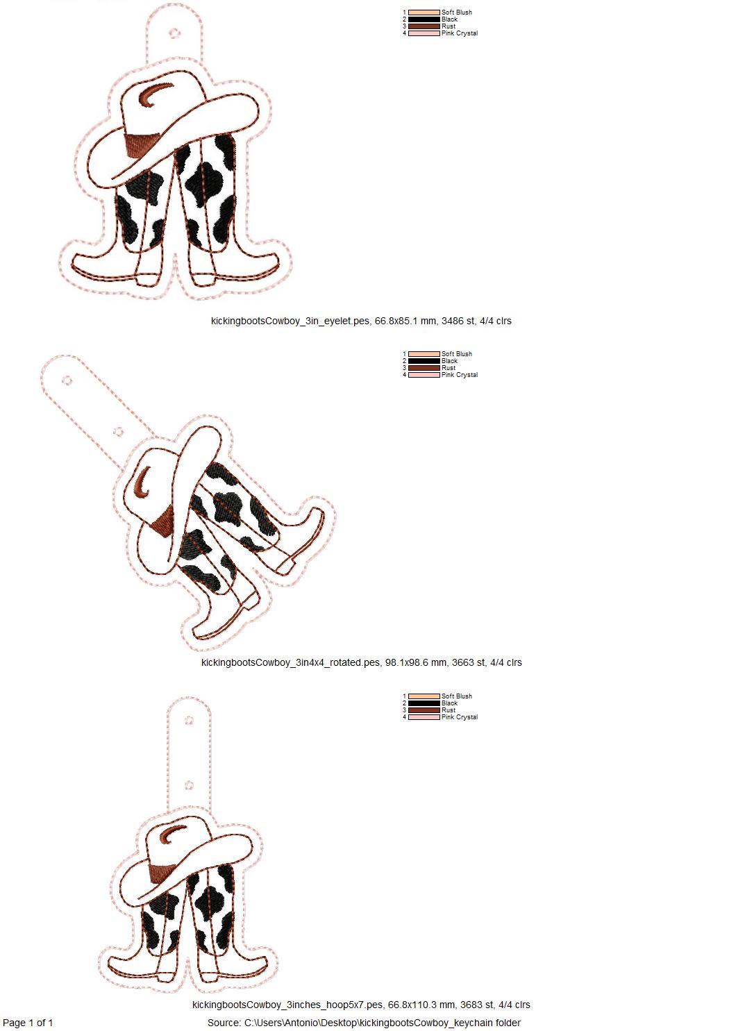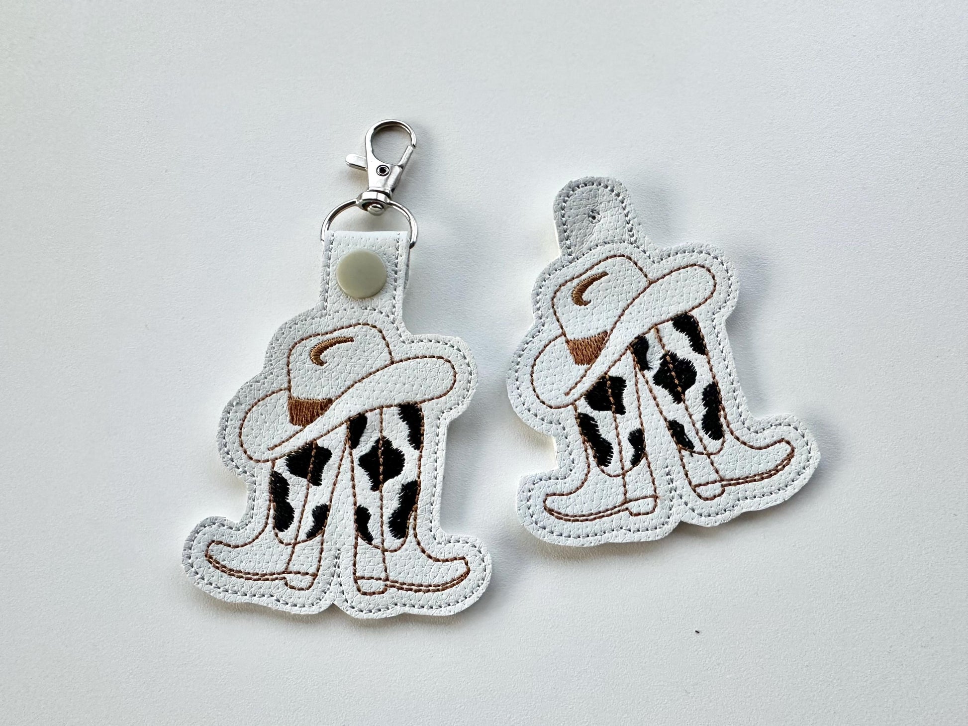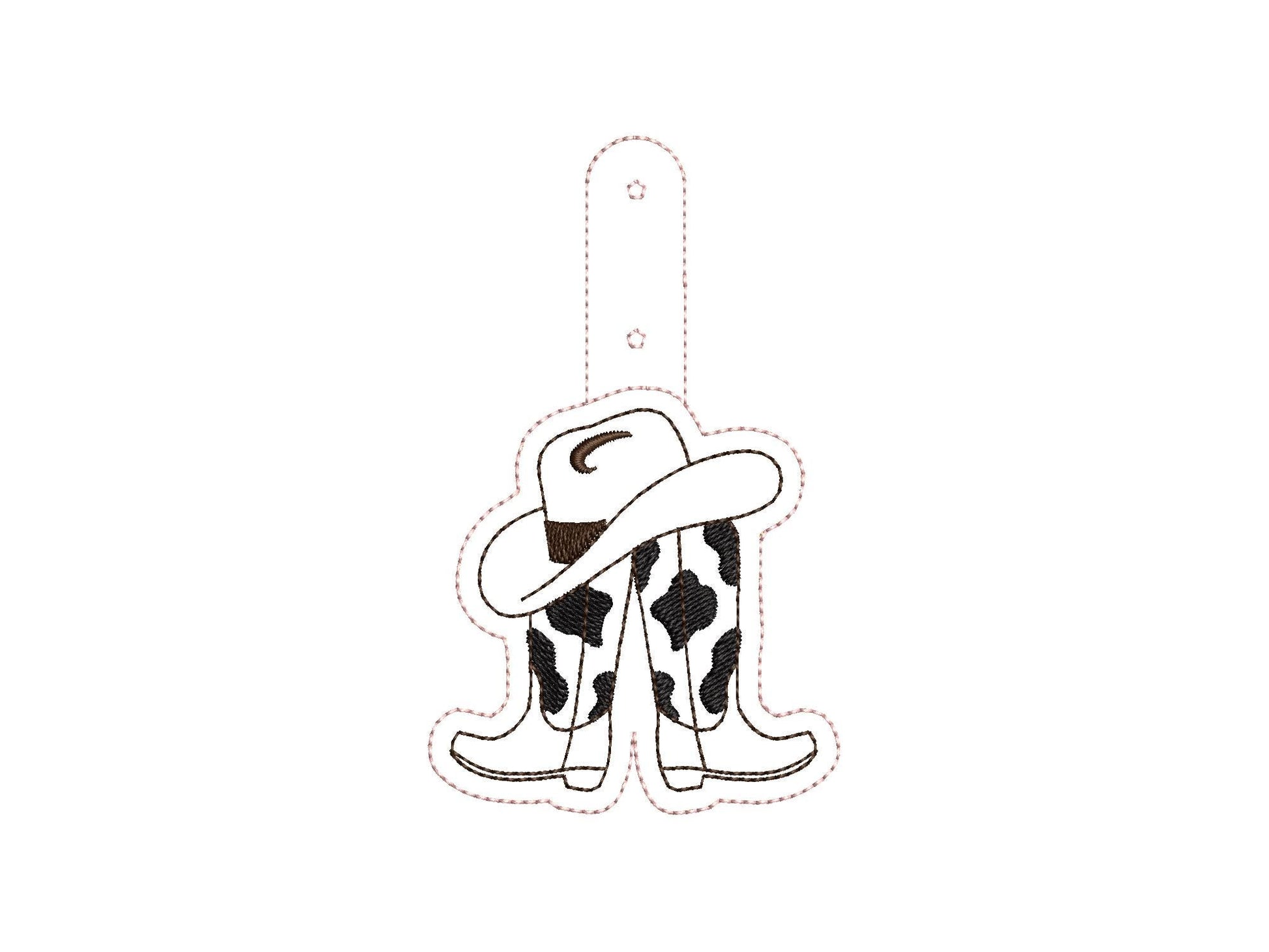 Cowboy Boots Hat Eyelet and key fob snap tab keychain in the hoop machine embroidery designs ITH Farm Cowgirl kids boys bag tag gift idea