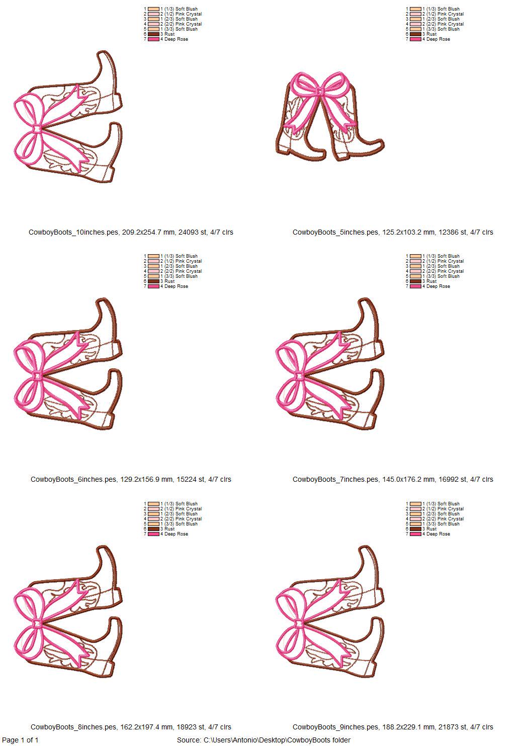 Cowboy Cowgirl Boots and Bow side bow split seam Applique machine embroidery designs Girl t-shirt Bow ribbon many sizes from 5 to 10 inch