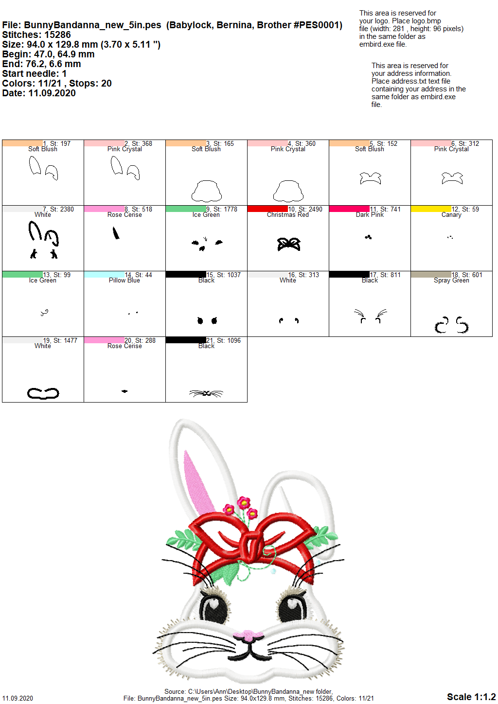 Color charts: PDF or image file with thread colors, stitch order, and counts