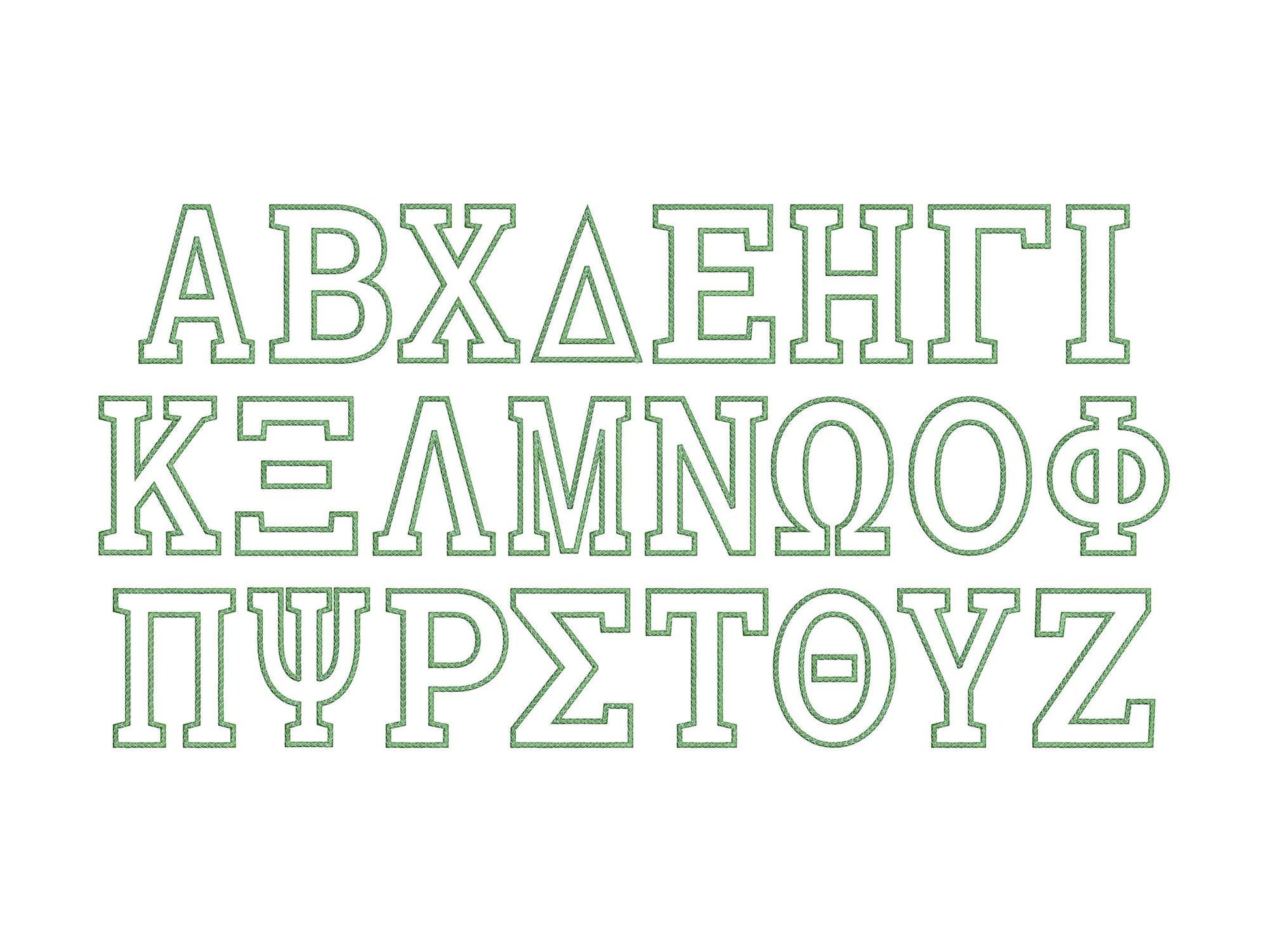 Entire alphabet Big Greek FONT satin stitch and top stitch Monogram sororities fraternities machine embroidery designs 4 up to 8 in letters with classic satin stitch outline and a nice decorative neat top stitch.