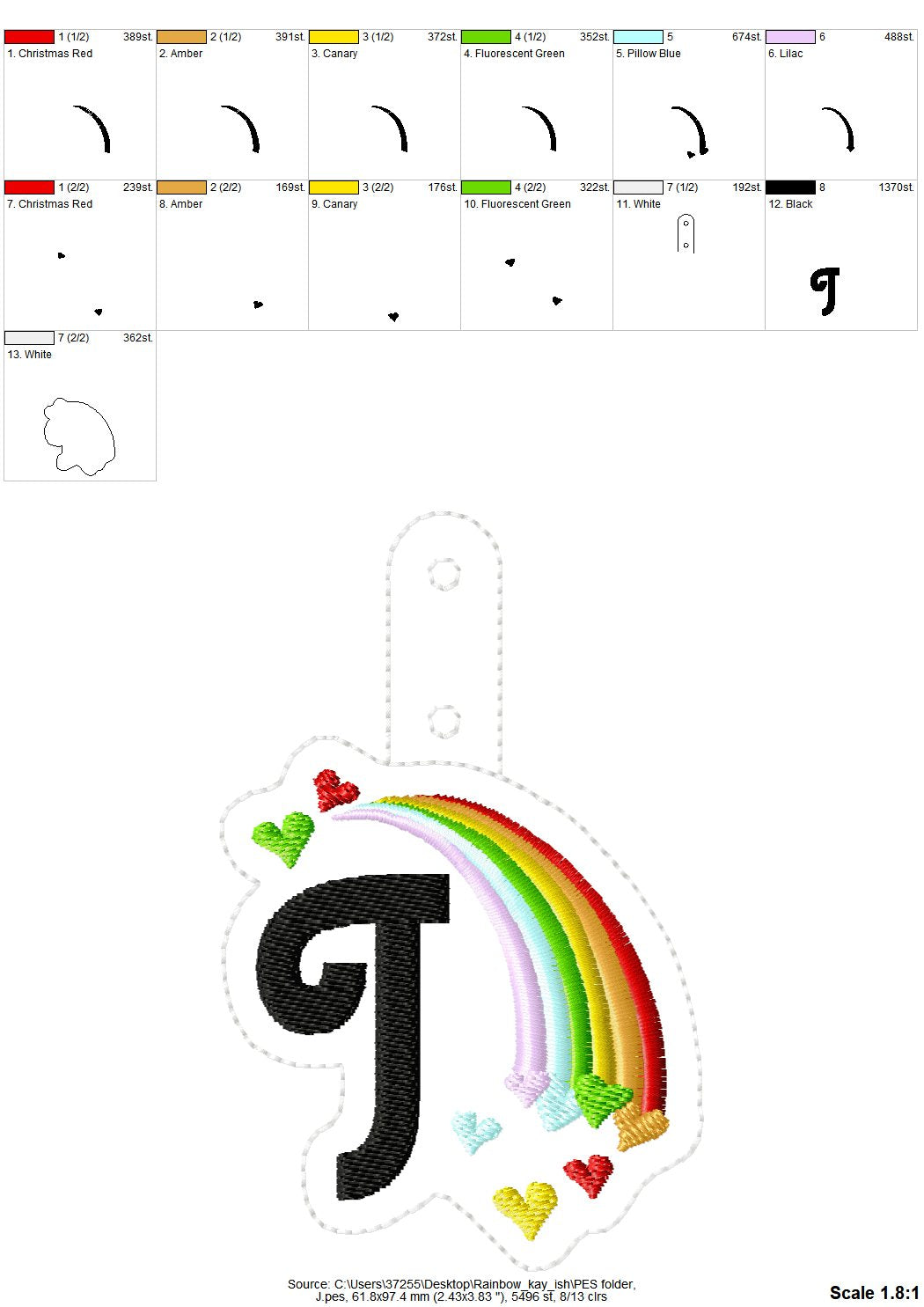 Falling heart rainbow monogram monograms alphabet, key fob ITH, snap tab keyfob machine embroidery design in the hoop embroidery project A-Z