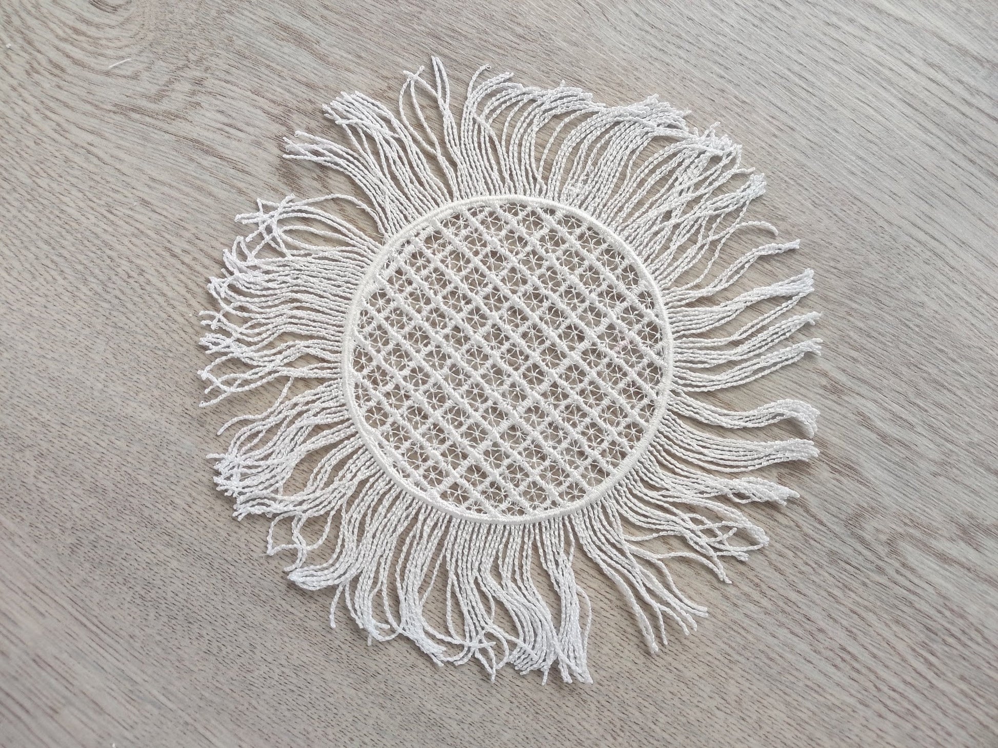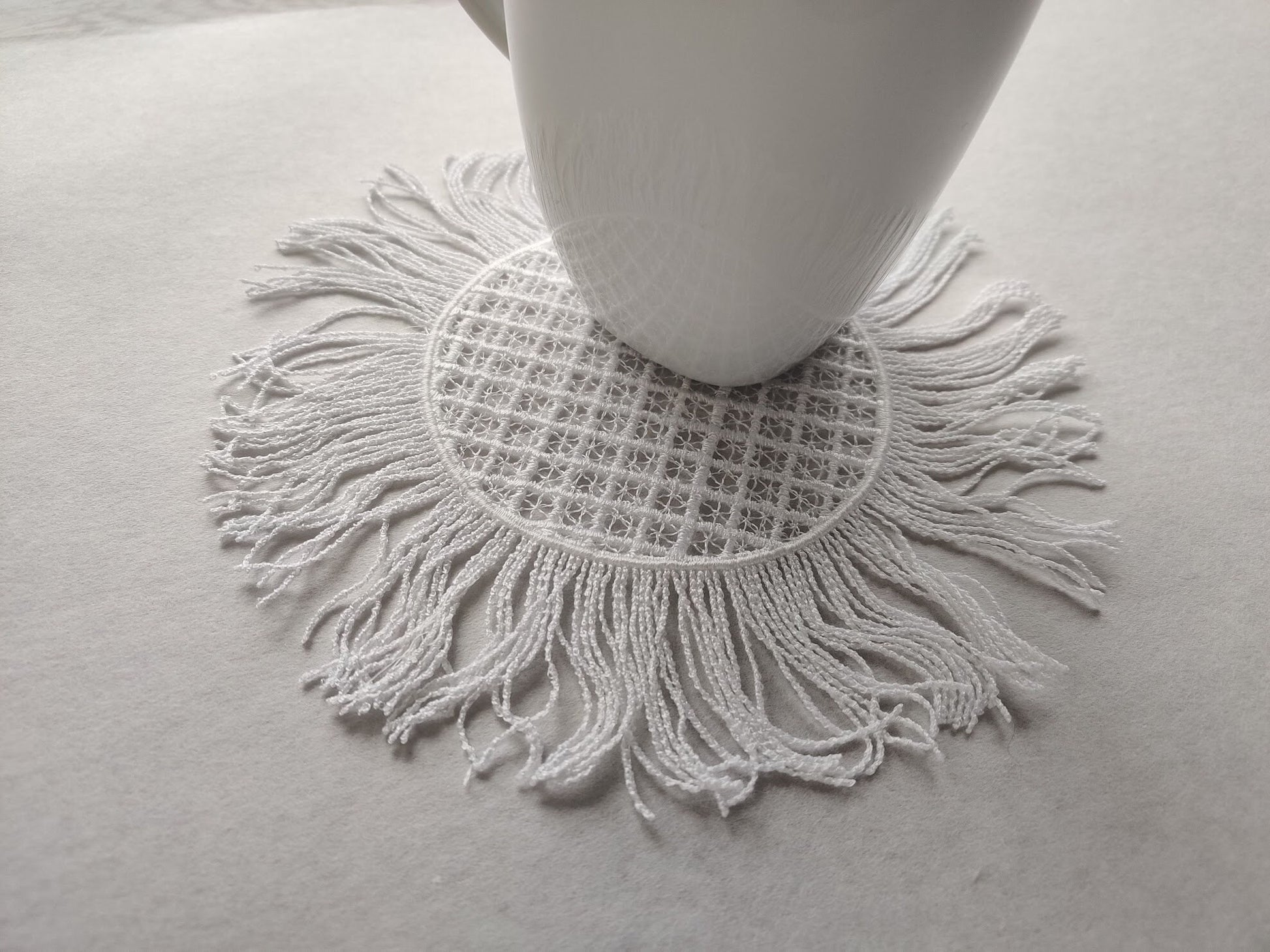 Flower round doily coaster with fringe fringed FSL Free standing lace machine embroidery designs in sizes 6x6, 8x8 inches in the hoop ITH
