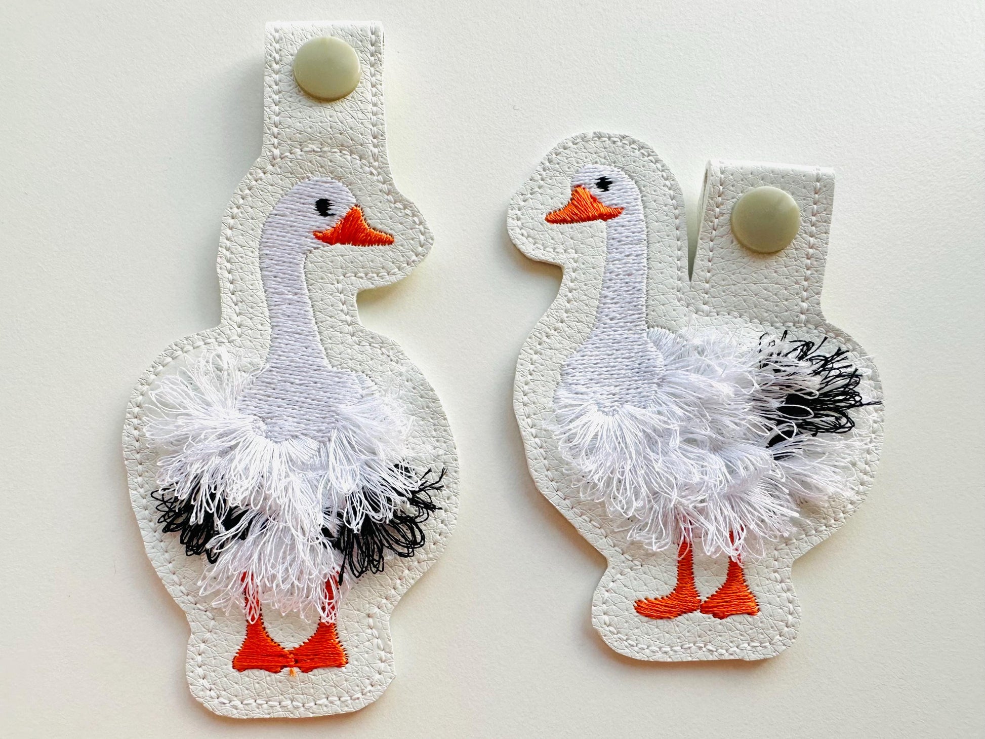 Fringed Geese key fob snap tab SET of 2 Goose keychain in the hoop machine embroidery designs ITH project bird fluffy fuzzy Gander Gosling 2 designs included, each available in both eyelet and snap tab versions.