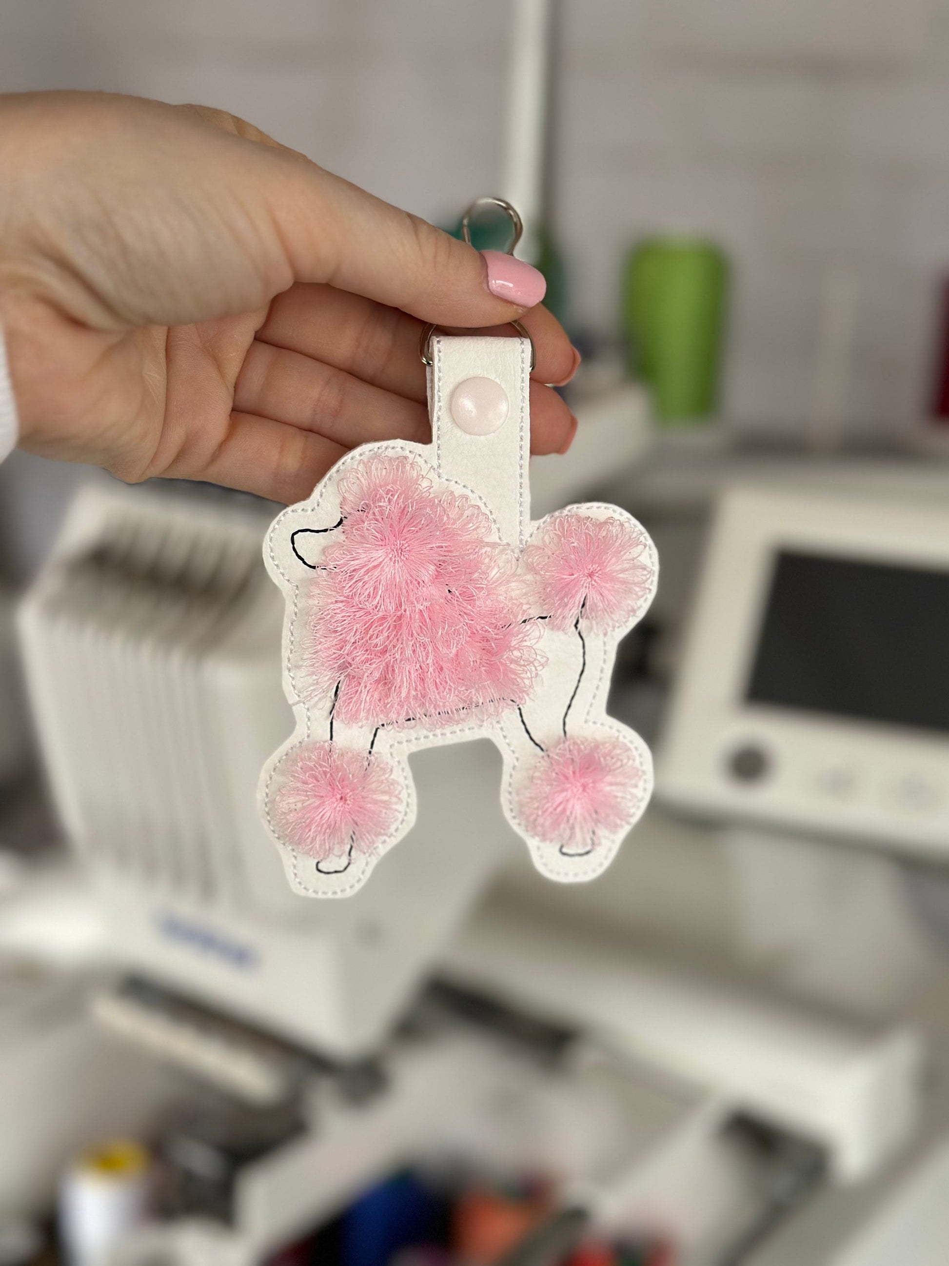Fringed Poodle key fob snap tab Fluffy Poodle dog keychain in the hoop machine embroidery designs ITH project fluffy fuzzy puppy gift idea
