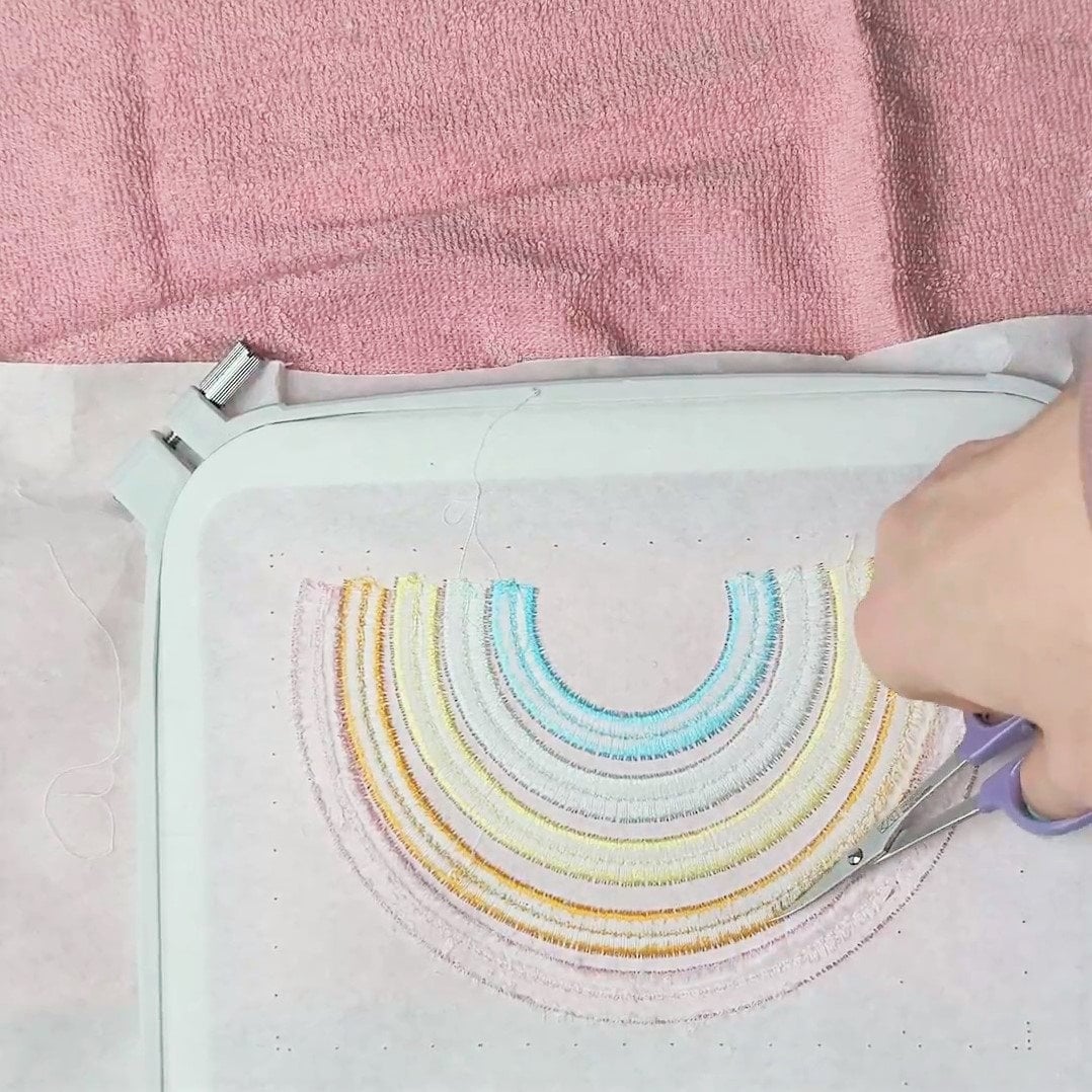 Absolutely safe for washing! Simply stitch the design, then turn your hoop over to view the back. Cut the bobbin threads behind the satin stitches, and fluff up the fringe.