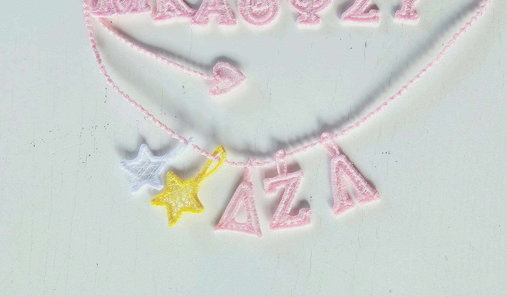 FSL Lace Embroidery Friendship Bracelet with Greek Letters Perfect for Fraternities Sororities and Sports Teams machine embroidery designs Enhance your fraternity, sorority, or sports team spirit with this beautifully crafted FSL (Freestanding Lace) Lace Embroidery Friendship Bracelet featuring Greek letters. Perfect for showing unity and pride, this machine embroidery design offers both elegance and durability.
