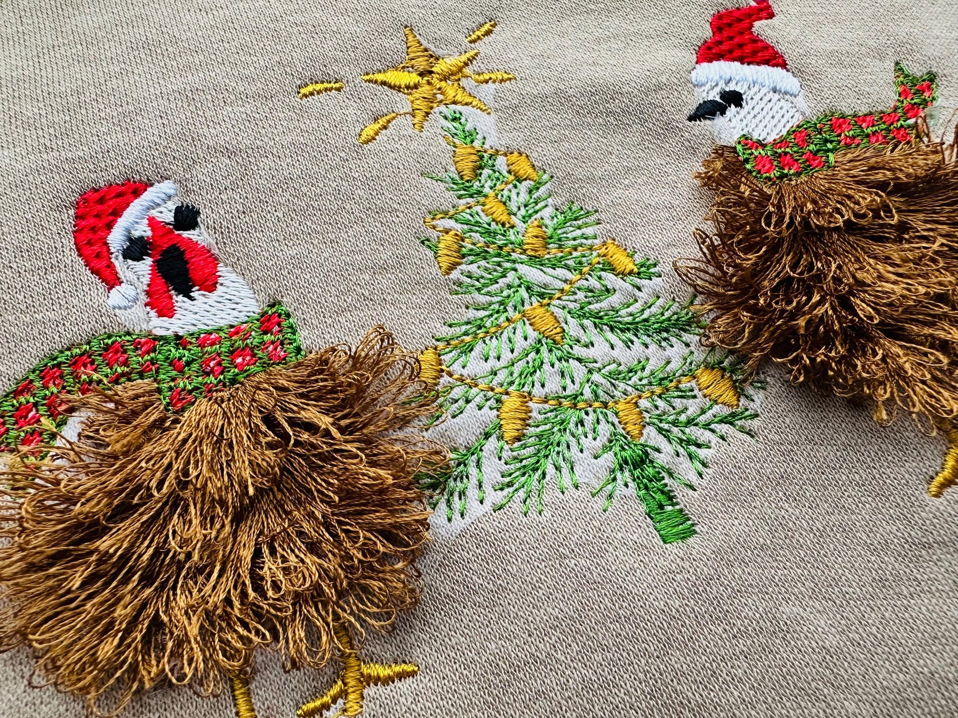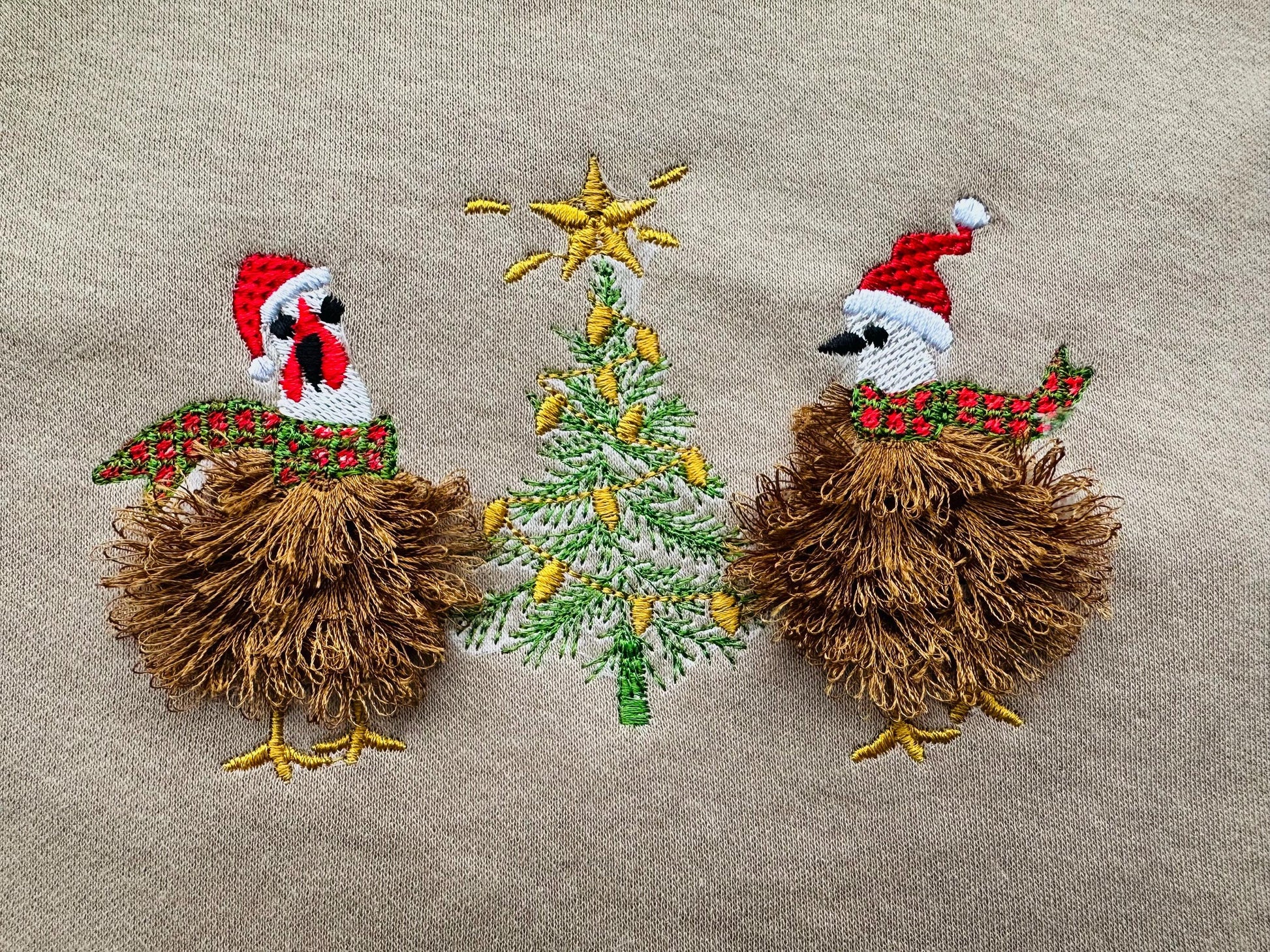 Funny Santa Chicken and Christmas Tree fringed fluffy chenille farm bird machine embroidery designs awesome fringe fur Chickens 5 and 6 inch