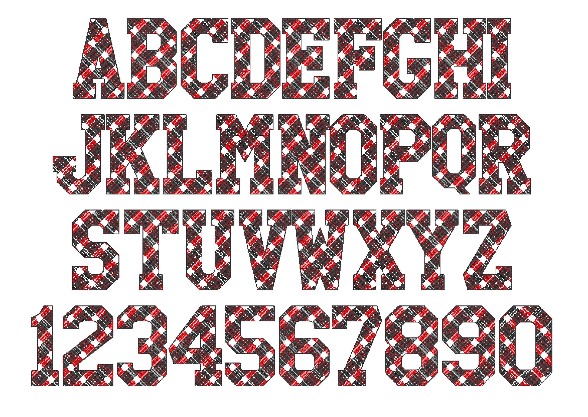 Gingham Block athletic Varsity Font letters numbers machine embroidery designs in sizes 2, 3, 4, 5, 6, 7in Buffalo Plaid Tartan checkered