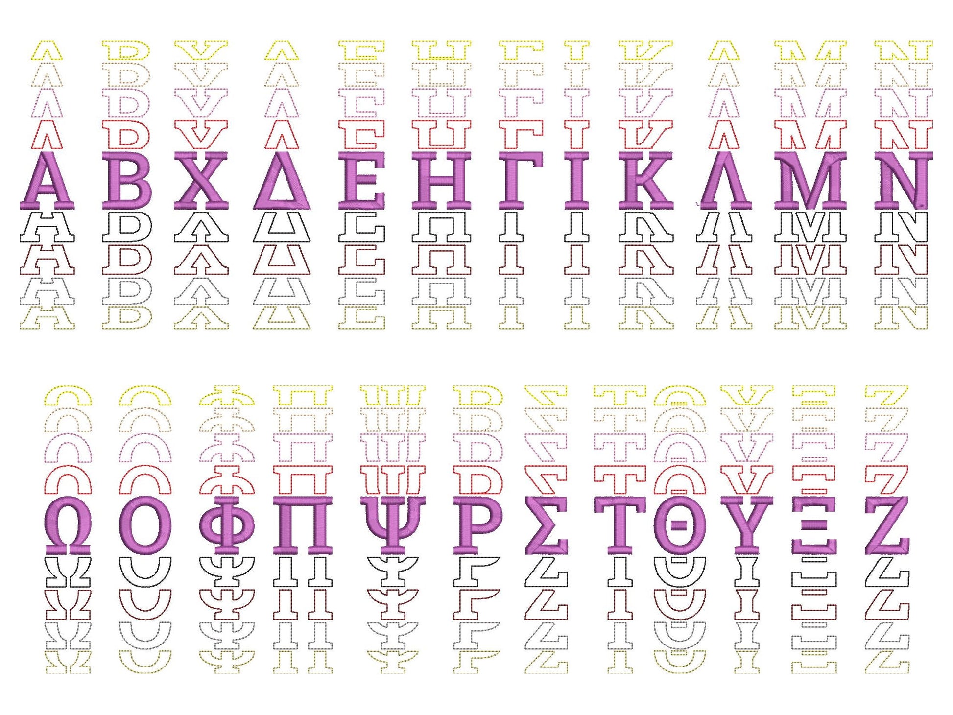 Greek Stacked Font Satin stitch and outline alphabet letters trend Font machine embroidery designs in assorted sizes Alpha Beta Gamma, BX