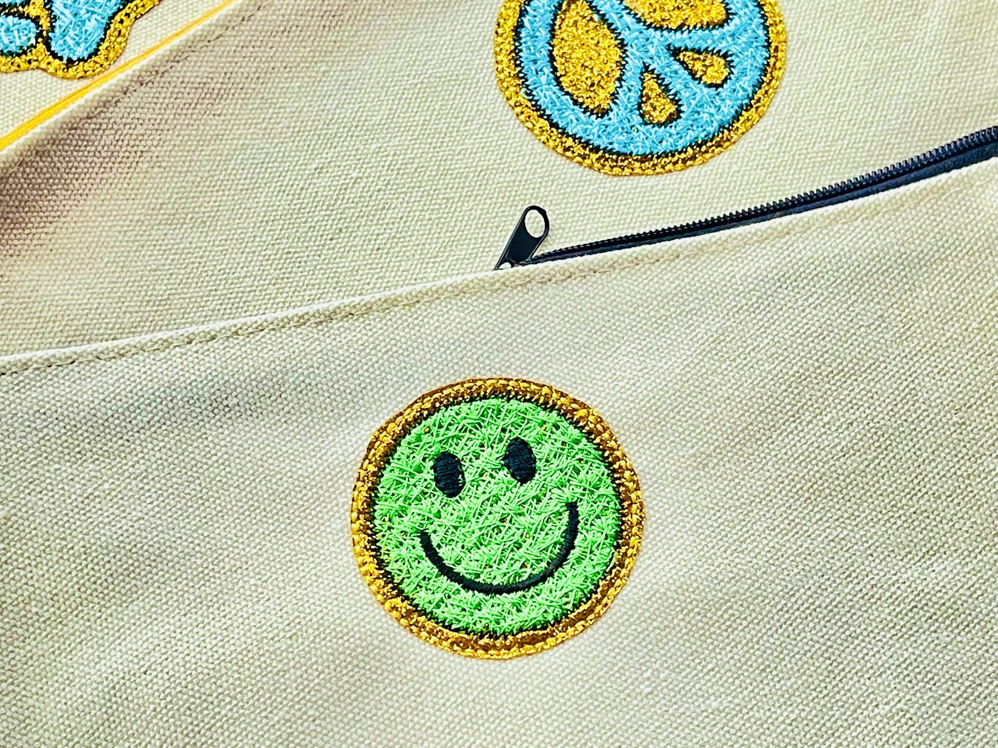 Happy Face Faux patch chenille stitches and Glitter HTV scraps glitter vinyl machine embroidery designs size 2 inches, happy face