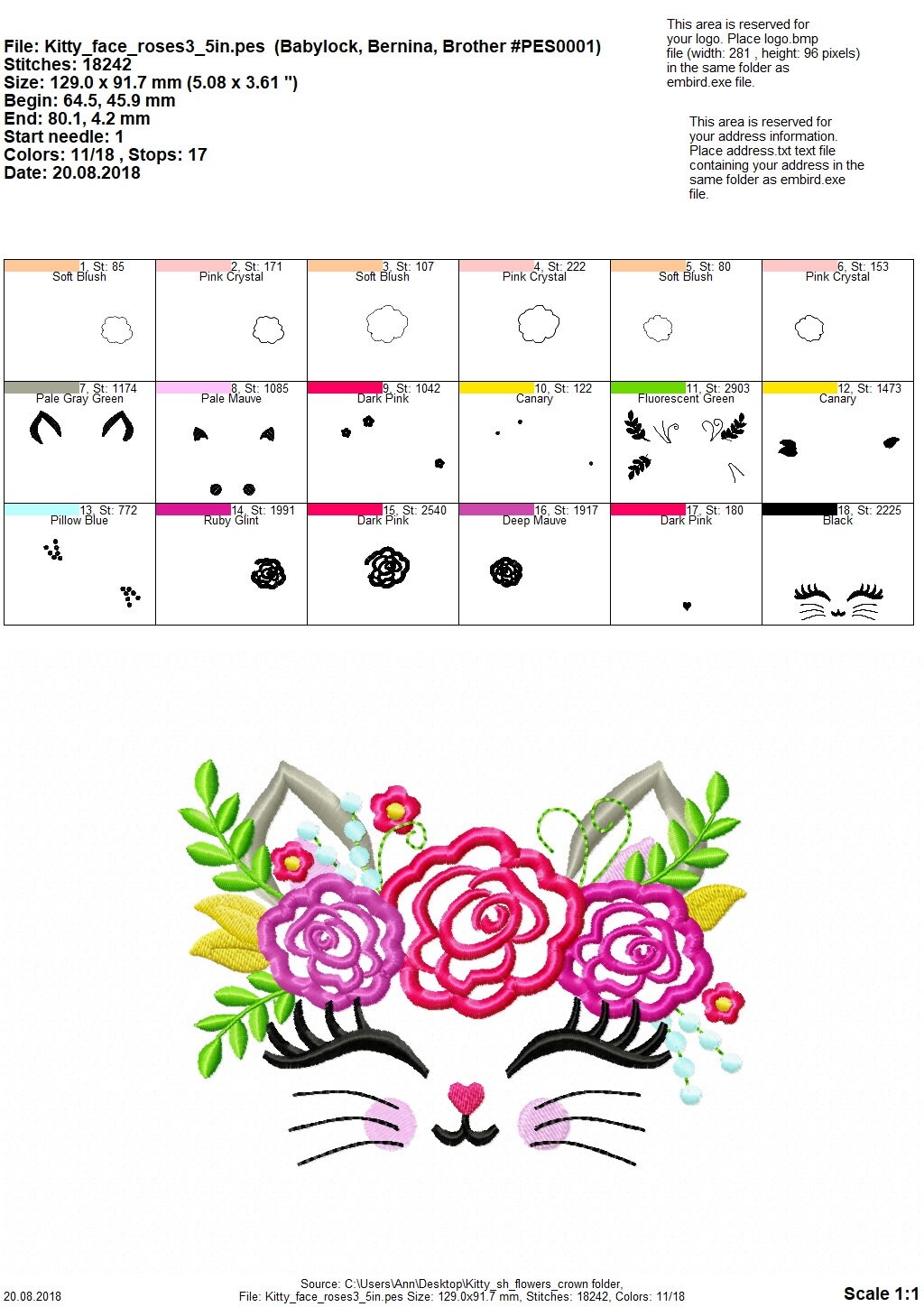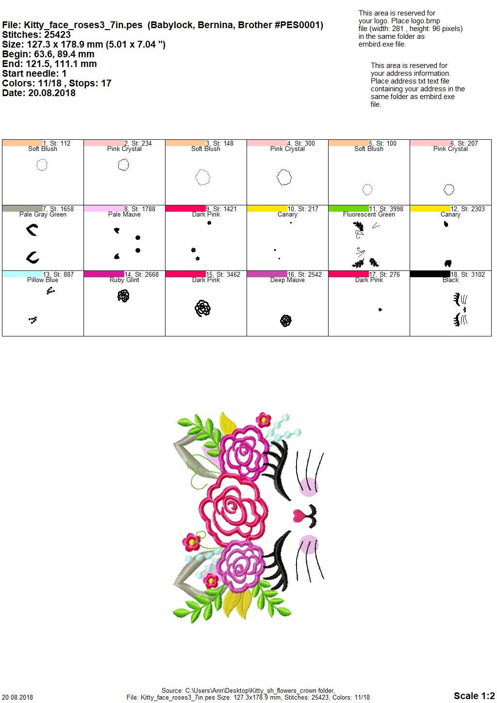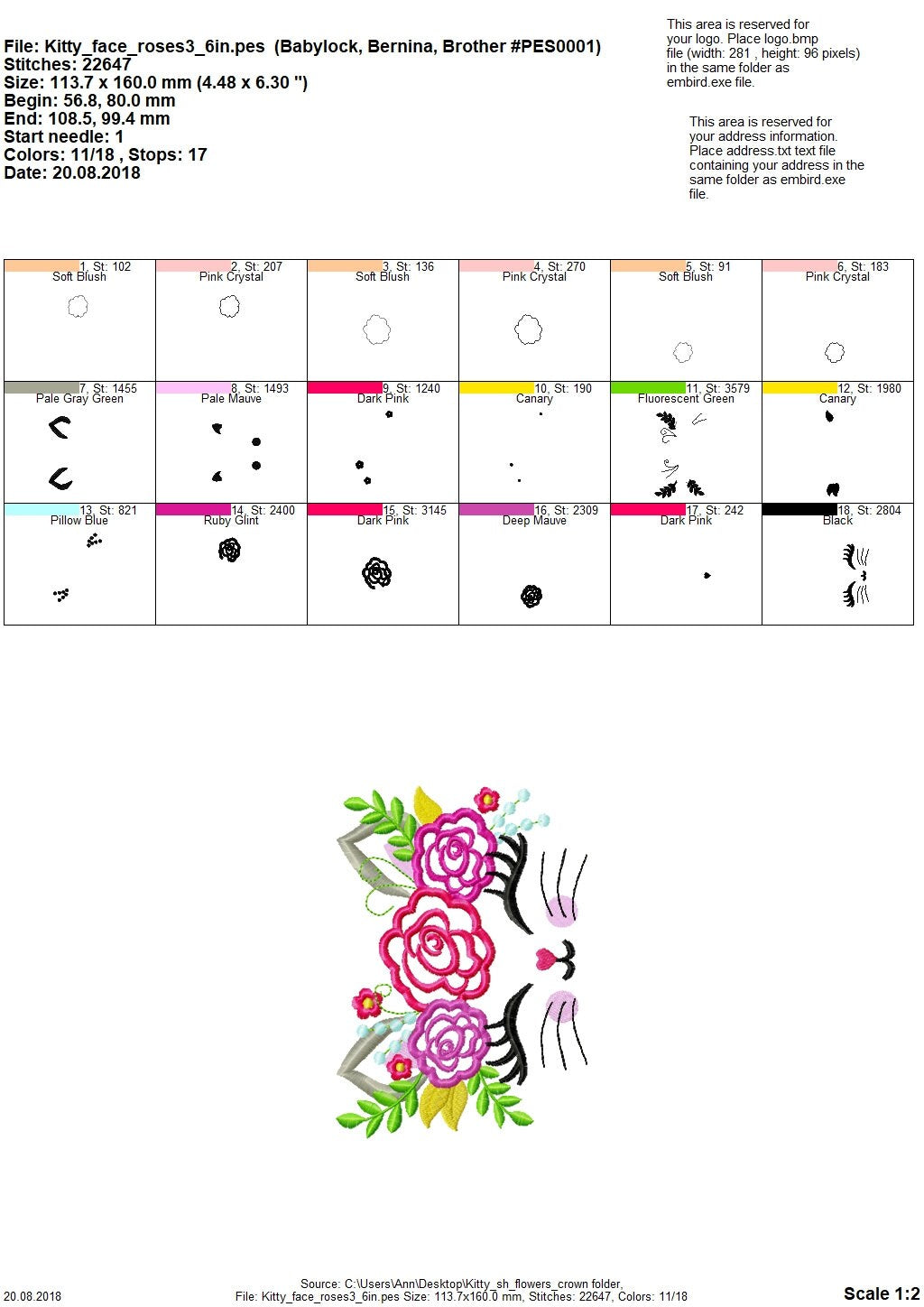 Kitty face with shabby chick roses crown applique machine embroidery applique embroidery design cat head kitty