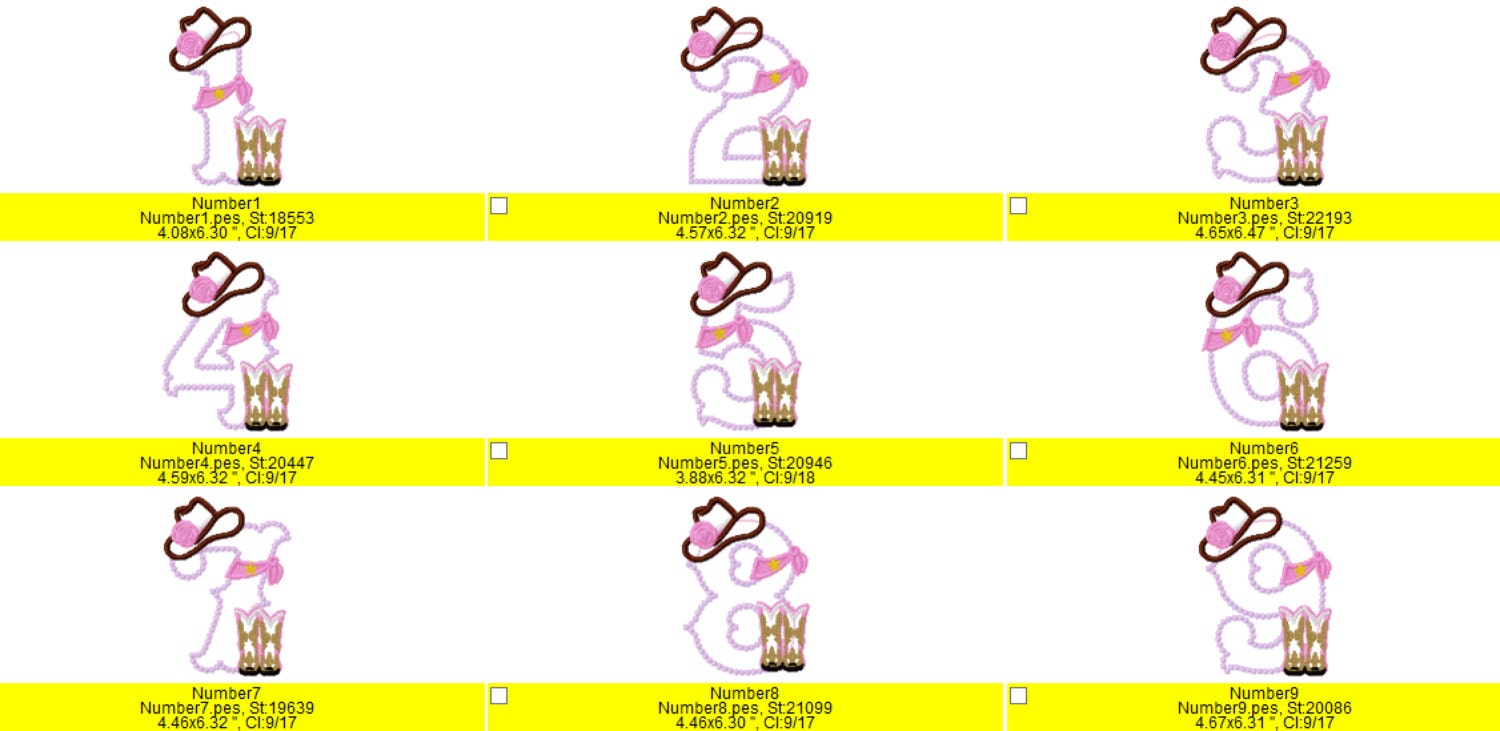 Lady Cowboy Birthday numbers whole set of numbers 1-9 Applique machine