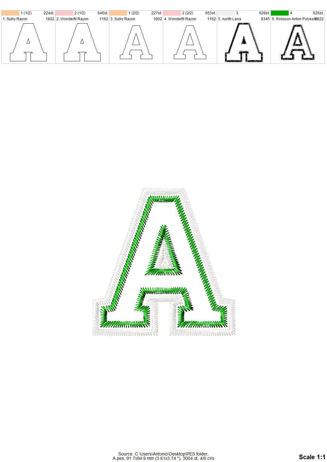 Letters are 2-step applique with ZIG-ZAG outline finish.