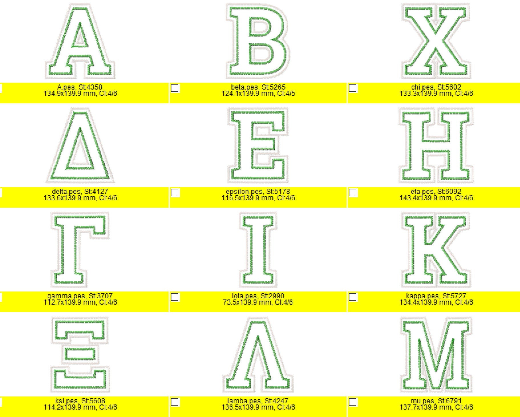 Large Greek alphabet ZIG ZAG outline and double two layer Applique Greek font letters Alpha Beta Gamma. 2 colors machine embroidery designs