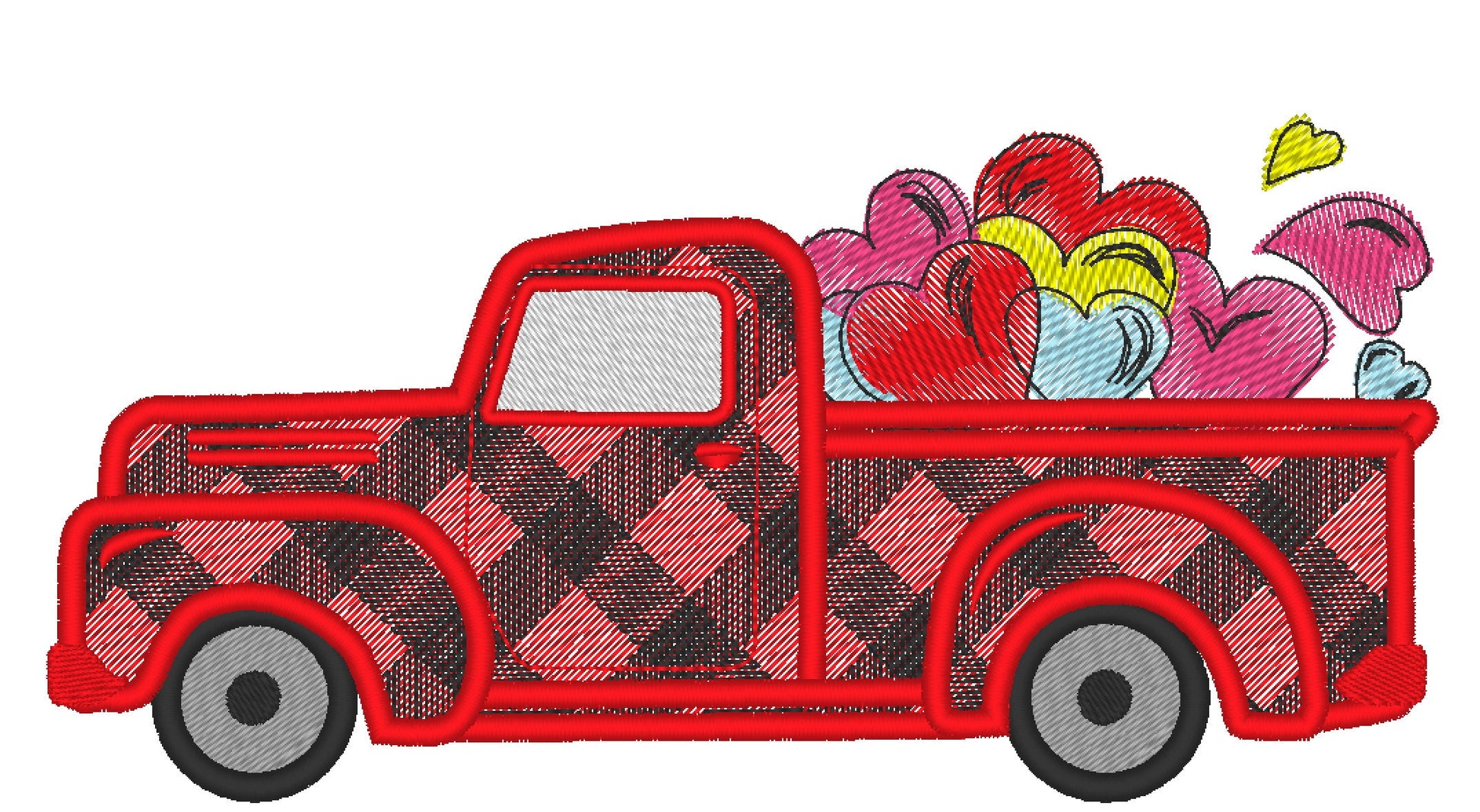Light sketch drawn vintage station wagon red truck, with hearts in the back, with floating heart machine embroidery fill design 4x4 5x7 6x10