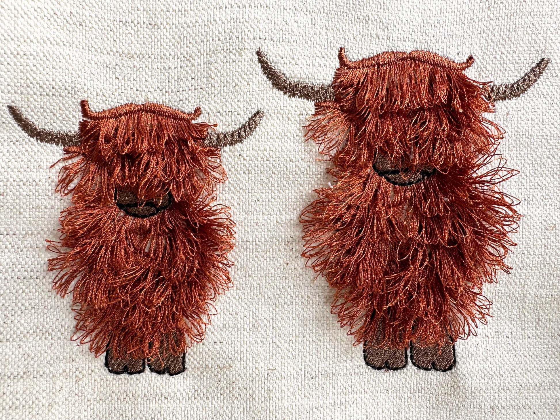 Longhorn Fringe Highland cattle Cow Scottish breed rustic cattle machine embroidery designs fluffy chenille fringed embroidery in the hoop