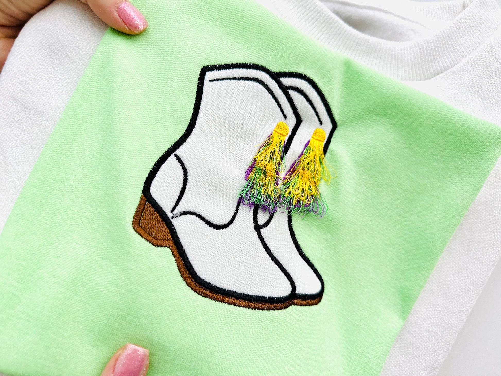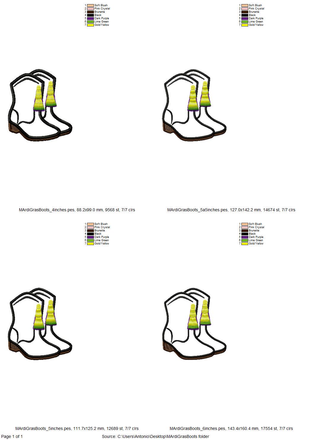 Mardi Gras Boots festival carnival Applique fringed fluffy tassels machine embroidery designs sizes 4 up to 6 inch Fat Tuesday shoes