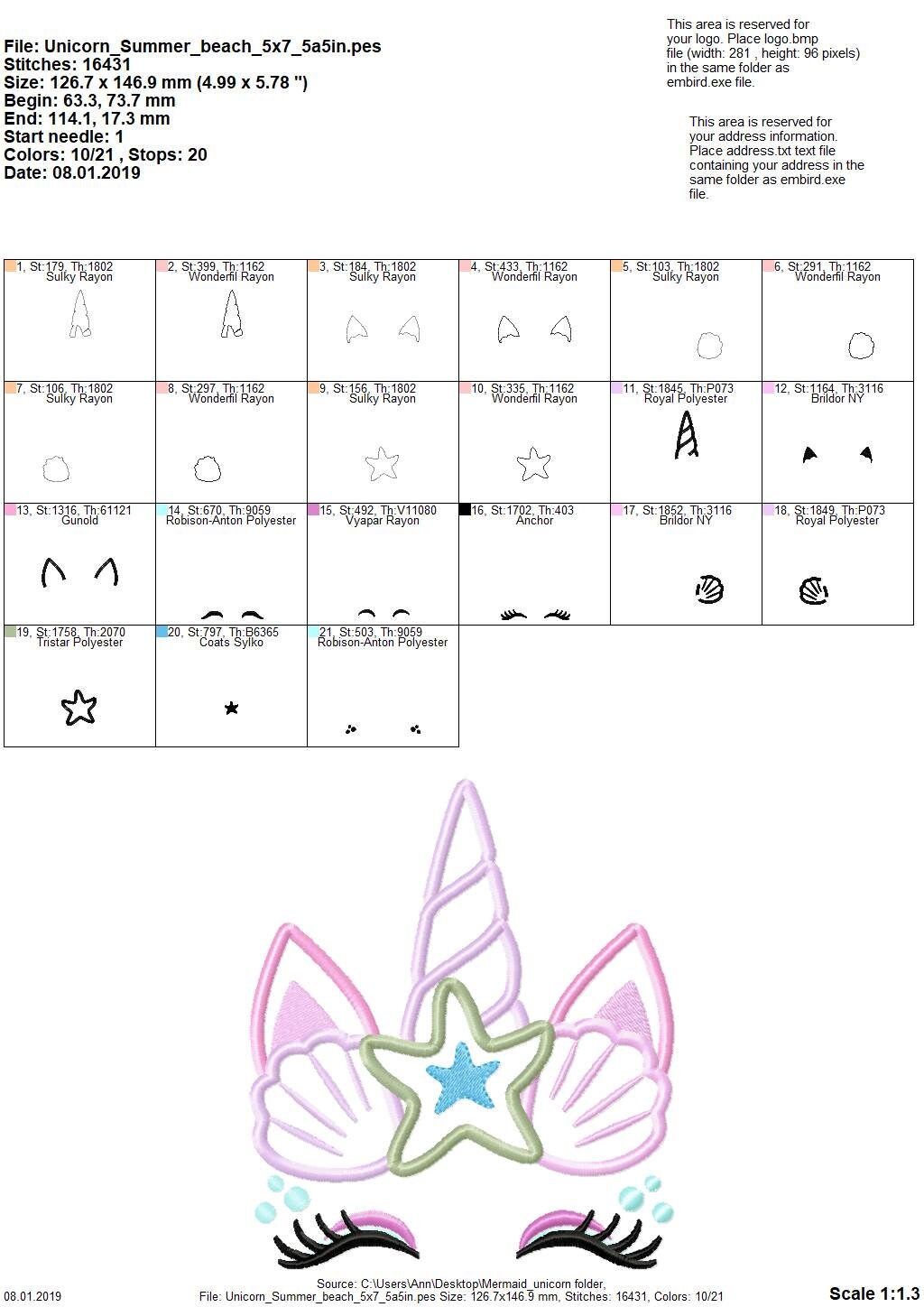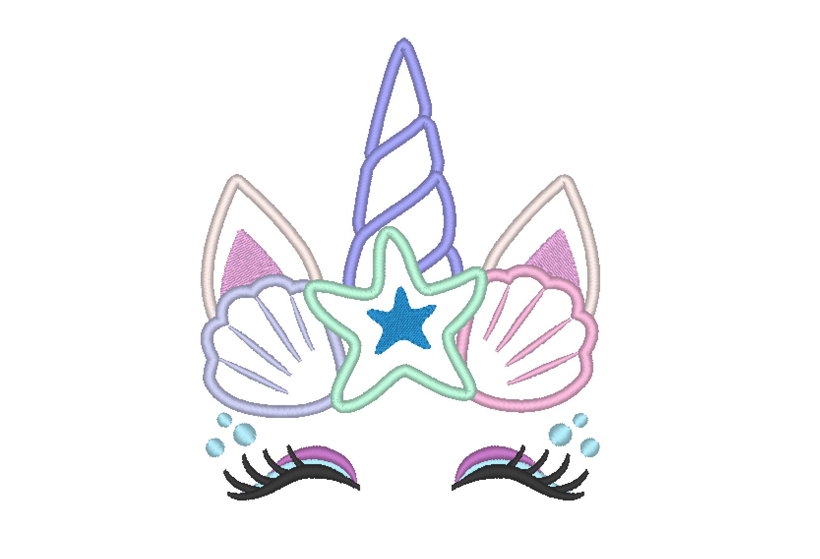 Mermaid Summer Unicorn head with shell and star crown applique machine embroidery designs Summertime unicorn face nautical, sea