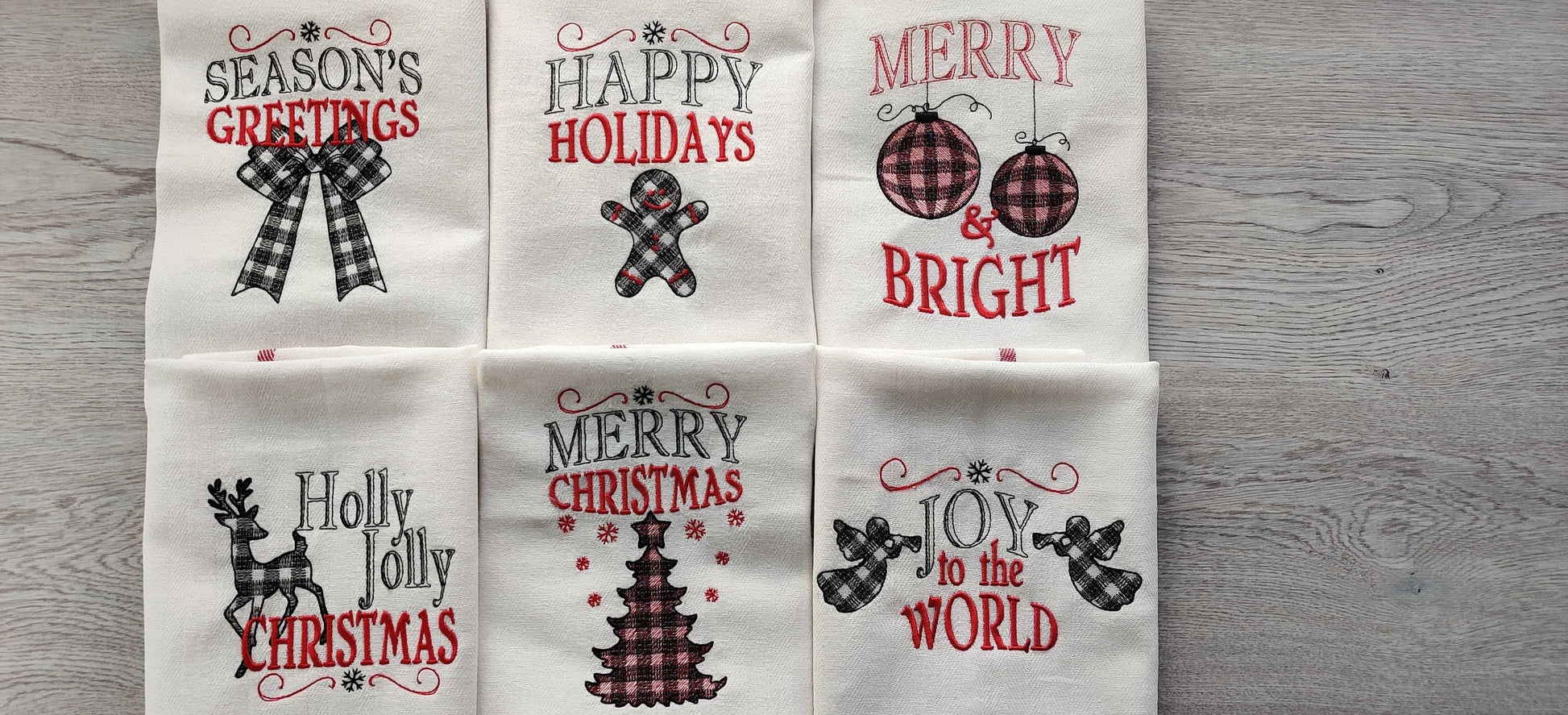 Merry Christmas gingham old fashioned classic Happy Holidays Joy Kitchen dish towel quotes 6pcs machine embroidery designs for hoop 4x4, 5x7