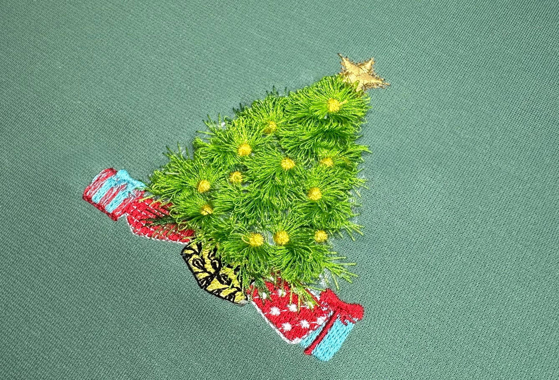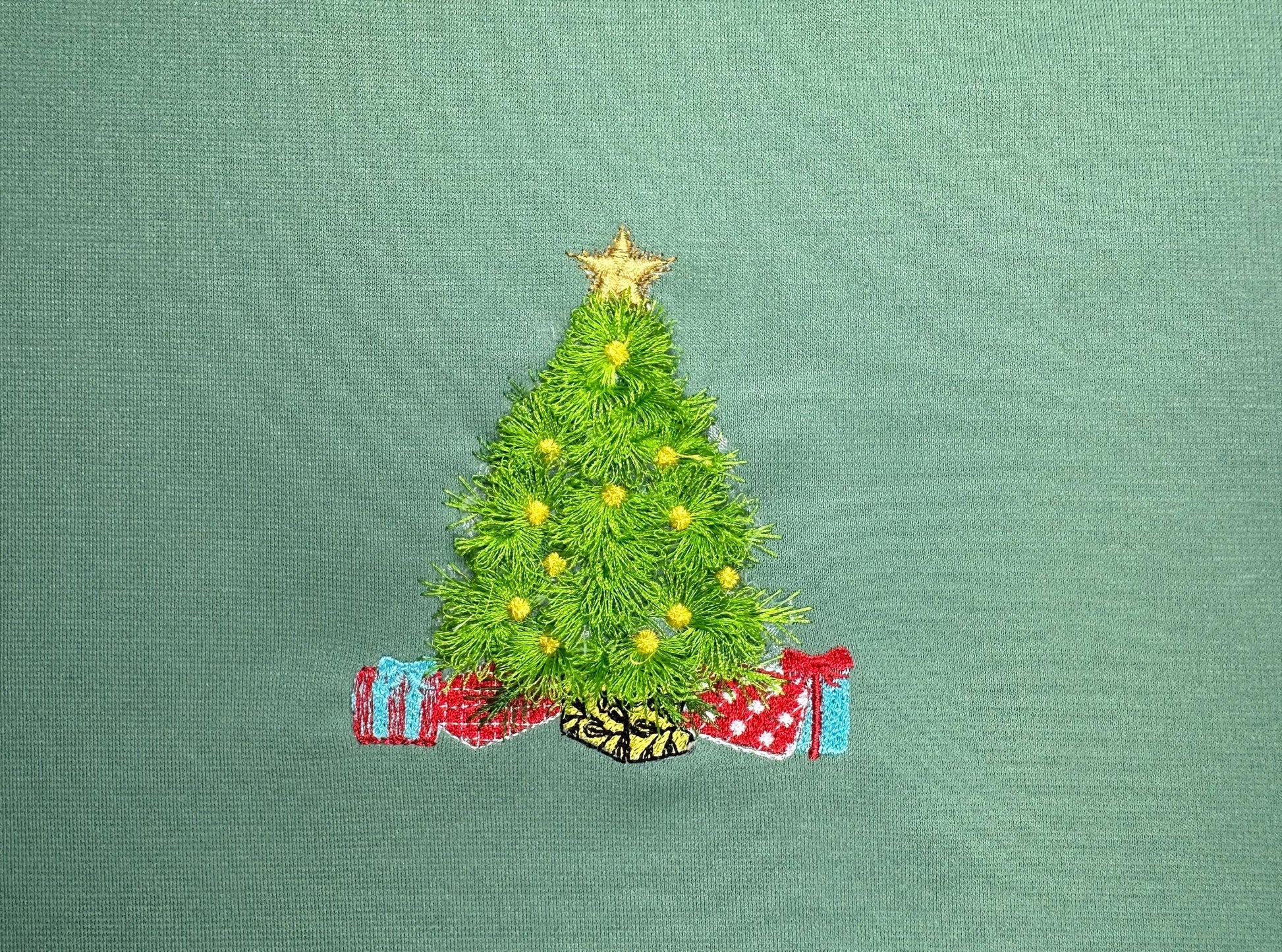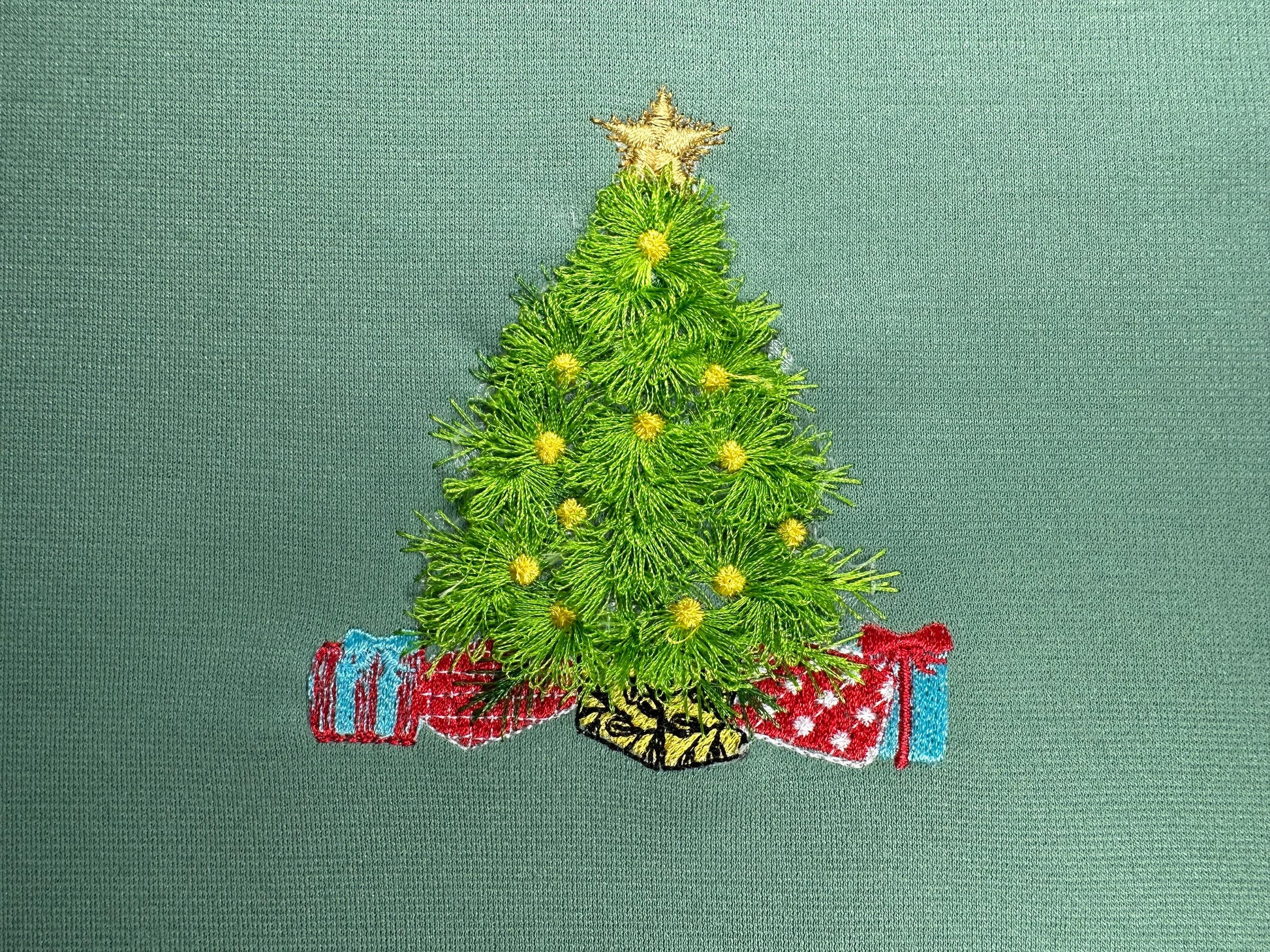 Mini Fringed fluffy Christmas Tree with holiday lights and gifts machine embroidery designs fringe Woodland Rustic Spruce small sizes kids