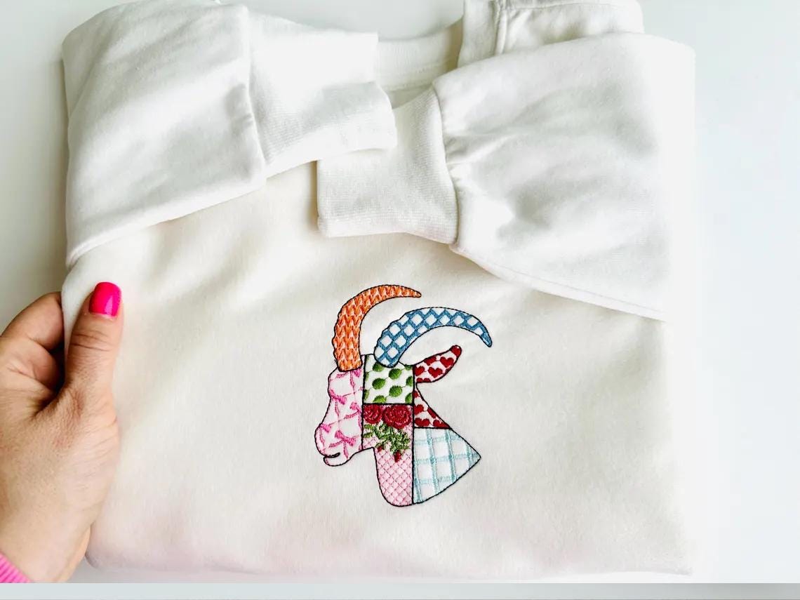 Patchwork Farm animals SET 6 designs Goat Highland Cow Horse face head Pig Duck machine embroidery designs Crazy sweater style Patterns are part of the embroidery. The fabric looks through. Stunning effect!