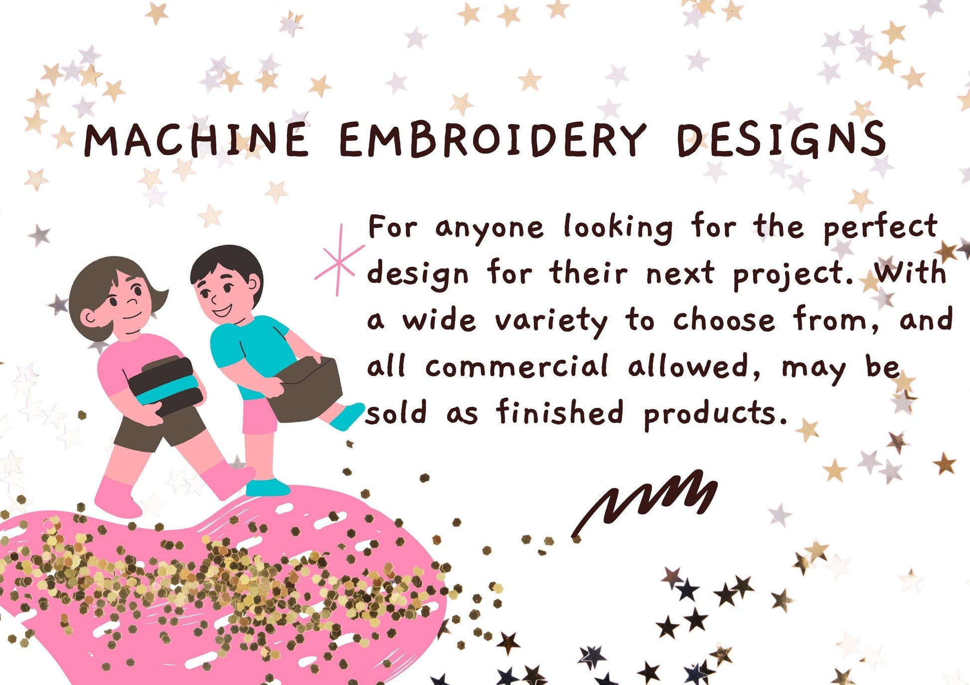 Formats: PES, DST, EXP, VIP, HUS, XXX, JEF, VP3, also BX for fonts and ART available on request.