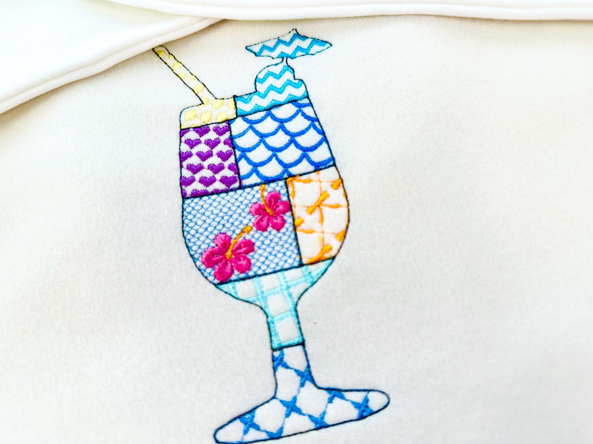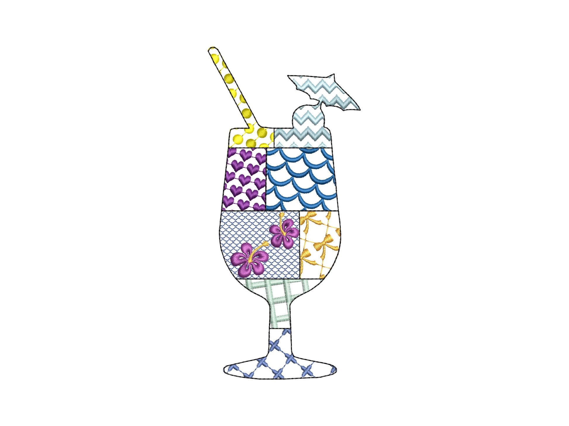 Patchwork Summer Cocktail with Straw Umbrella beach pool party drink glass silhouette outline machine embroidery designs sizes 4 up to 7 in