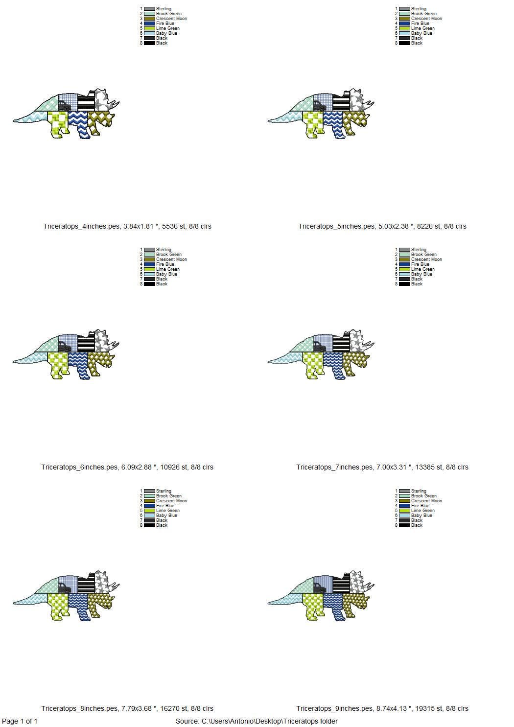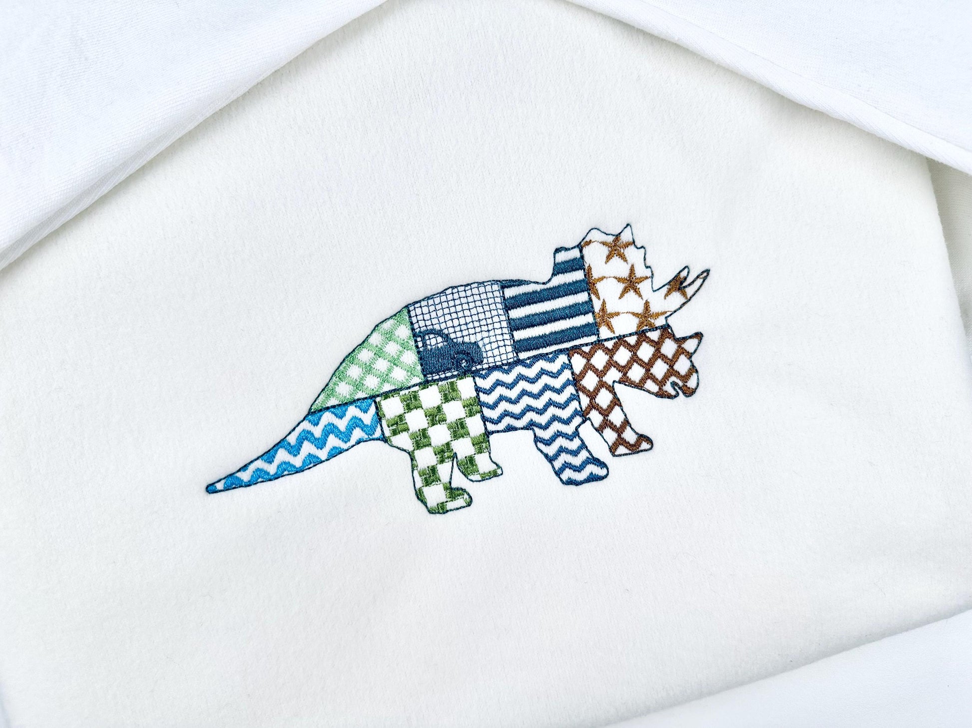 Patchwork Triceratops Dinosaur Jurassic animal Dino silhouette patterned outline kids boys machine embroidery designs sizes 4 up to 9 inch