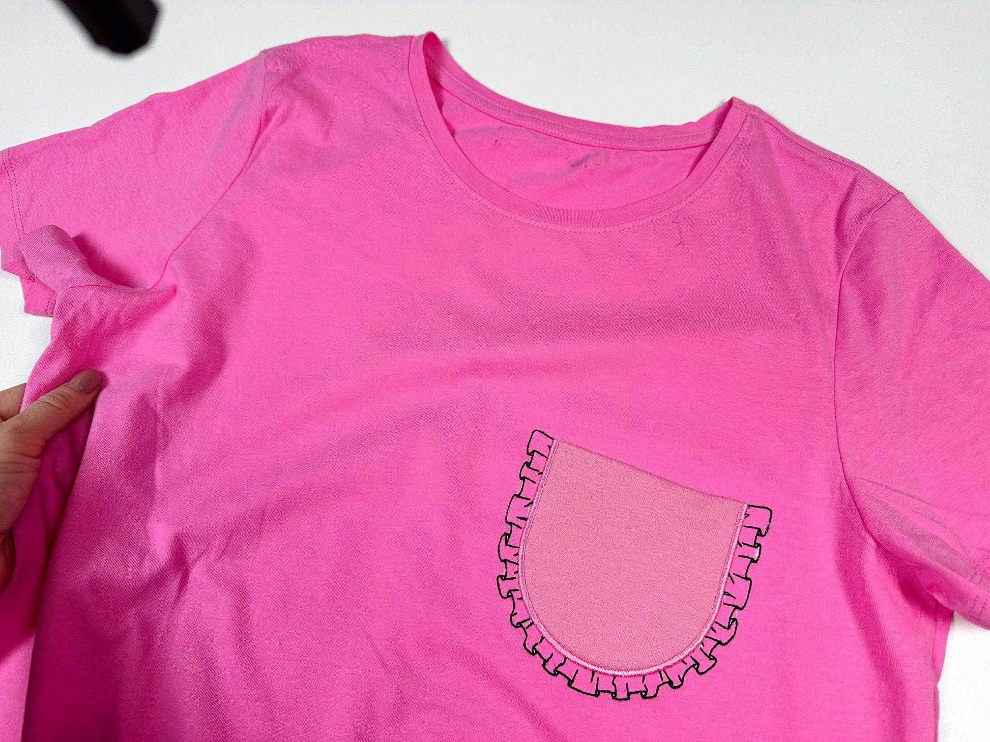 Stitch the placement line, place a piece of appliqué fabric over it, then stitch the tack-down line. Trim the excess fabric close to the seam, and finish with the cover stitches.