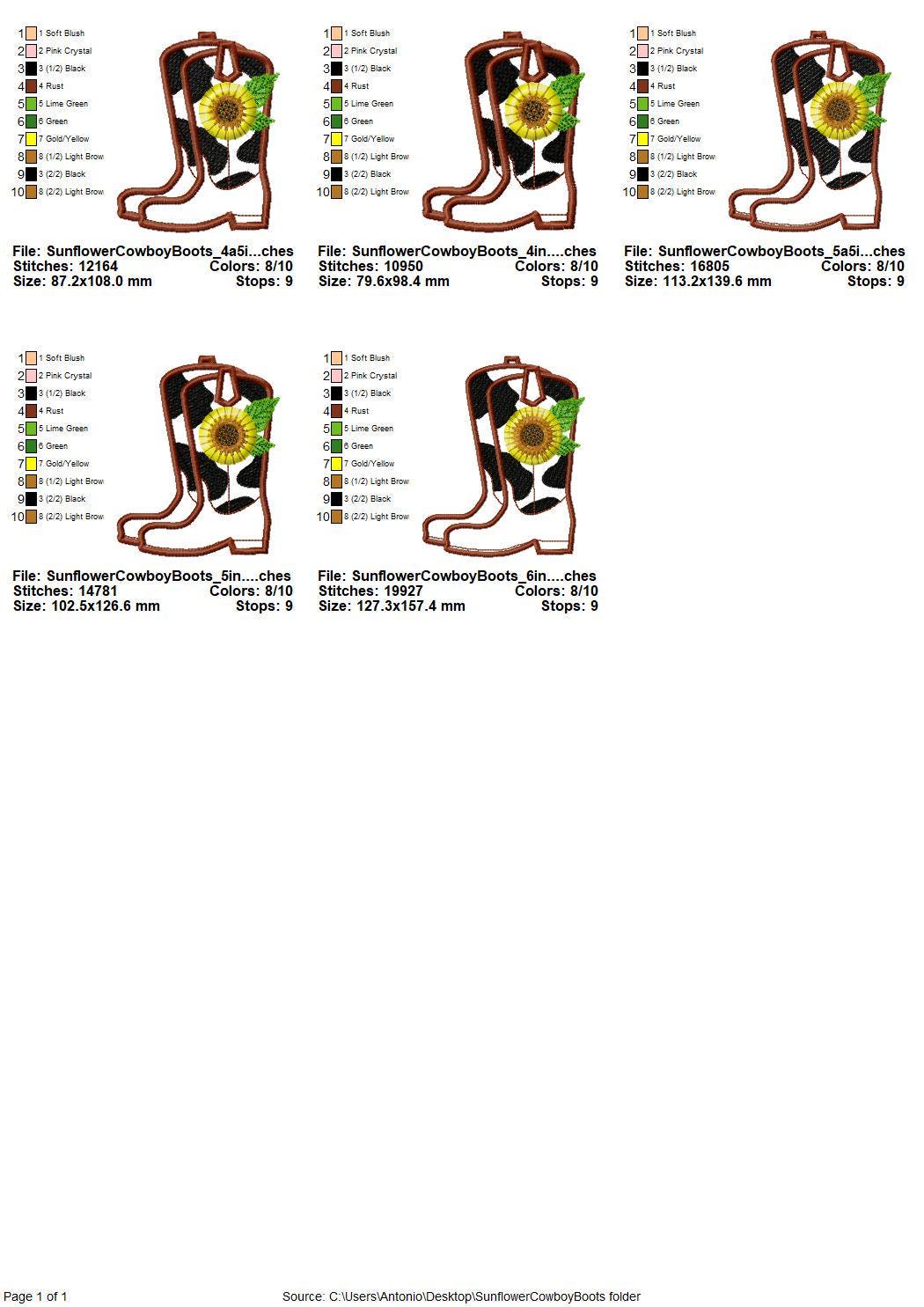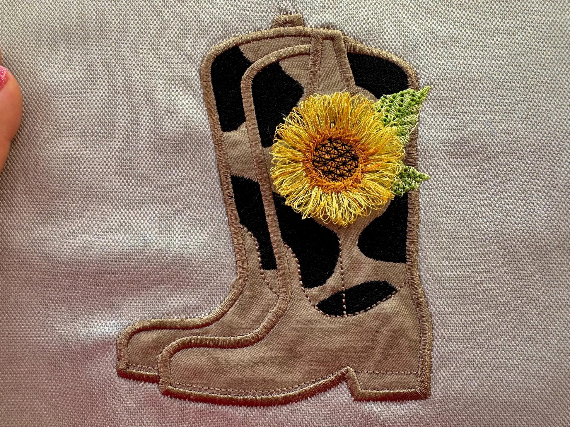 Pretty Cowgirl cowboy Boots and Hat Applique SET of 2 single designs fringed fluffy Sunflower machine embroidery designs sizes 4 to 6 inch