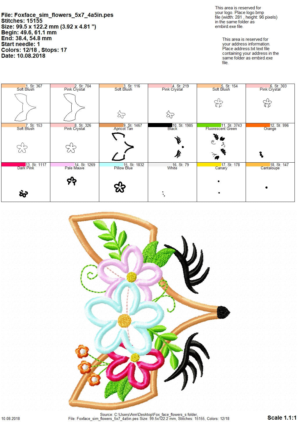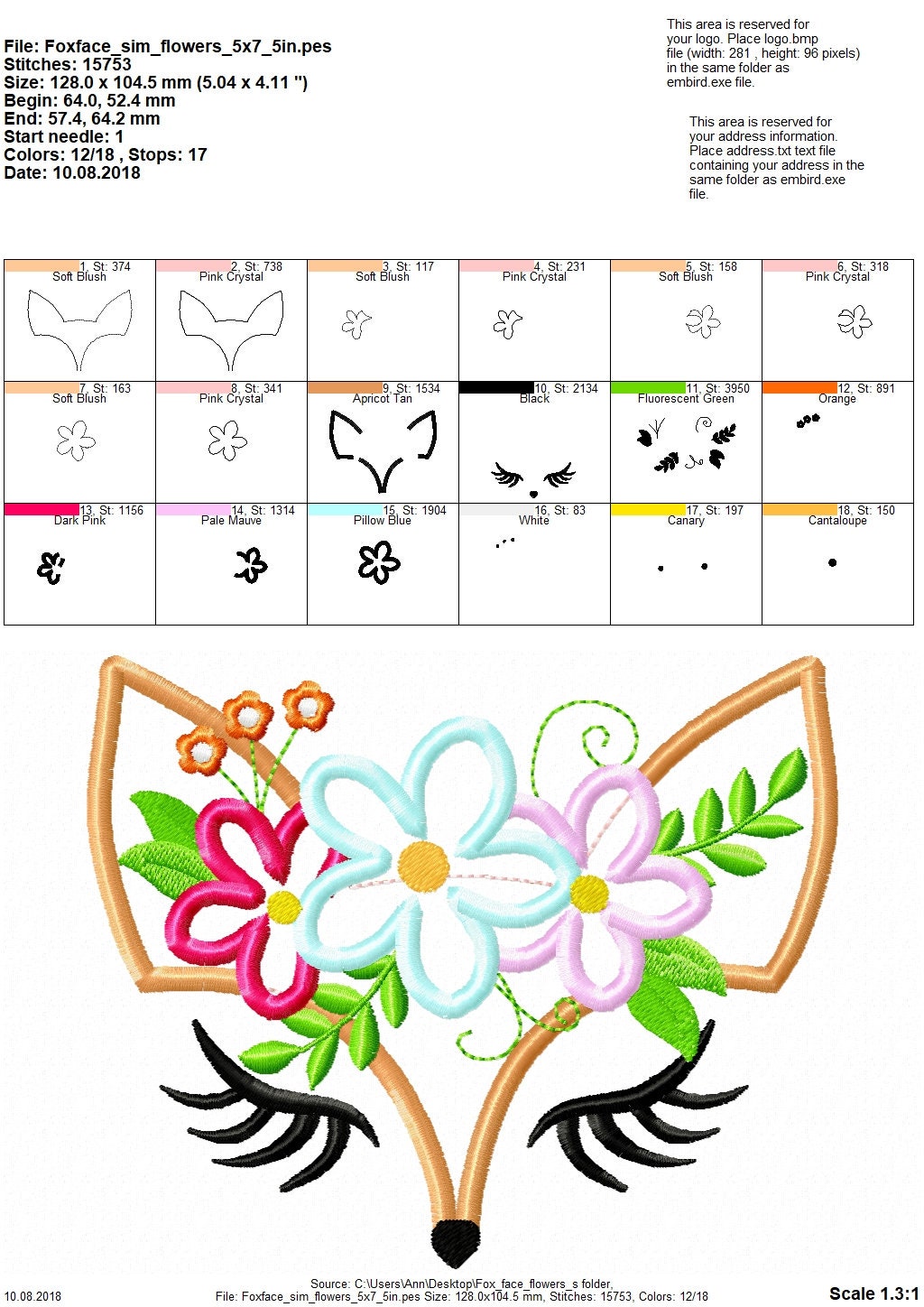 Color charts: PDF or image file with thread colors, stitch order, and counts