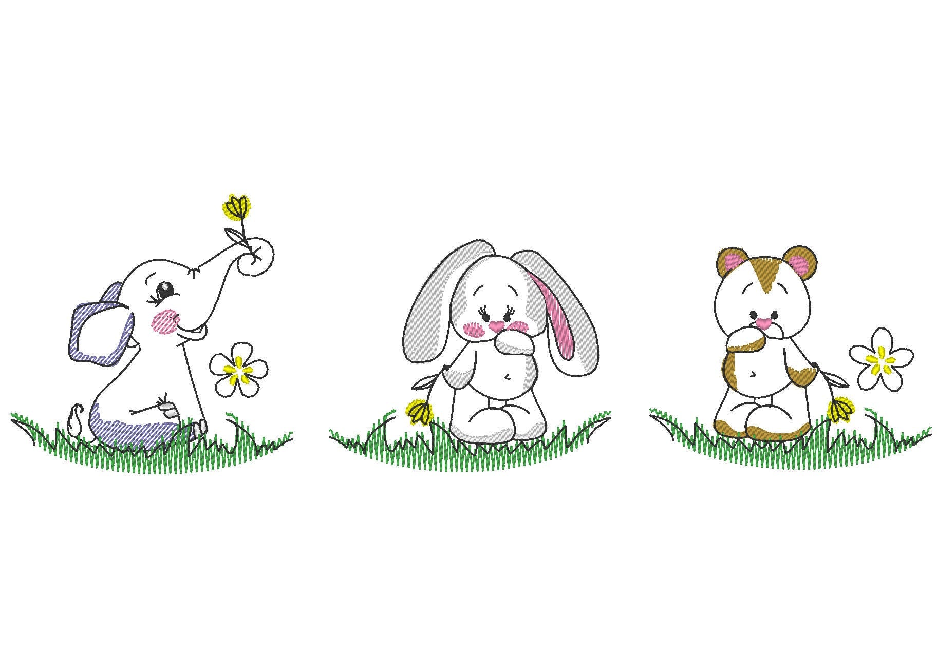 Redwork sketch outline baby nursery embroidery designs, baby bunny, elephant and teddy bear quick stitch embroidery designs 4x4, 5x7