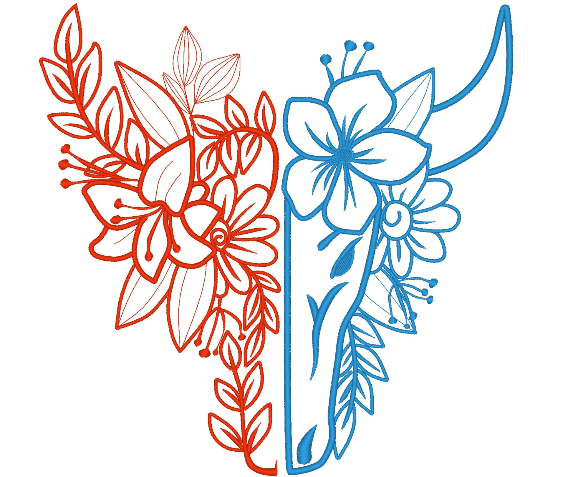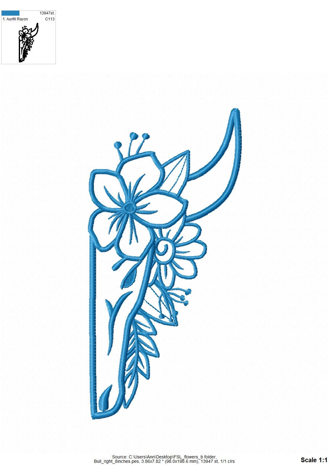 Split floral Bull Cow Head slips front hoodie zipper highland cow machine embroidery designs 7, 8, 9 and 10 inches flowered farm animal