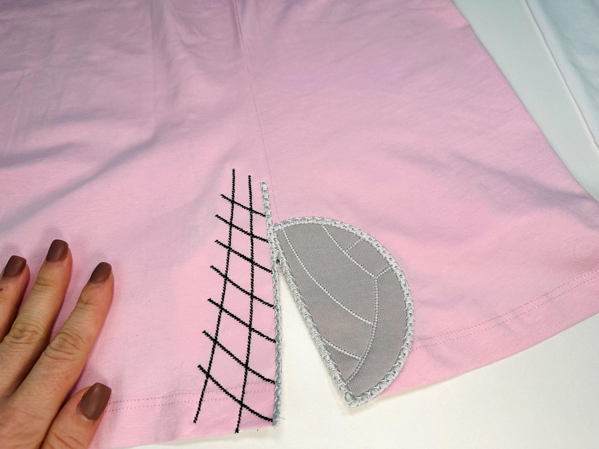 Stitch the placement line, place a piece of appliqué fabric over it, then stitch the tack-down line. Trim the excess fabric close to the seam, and finish with the cover stitches.