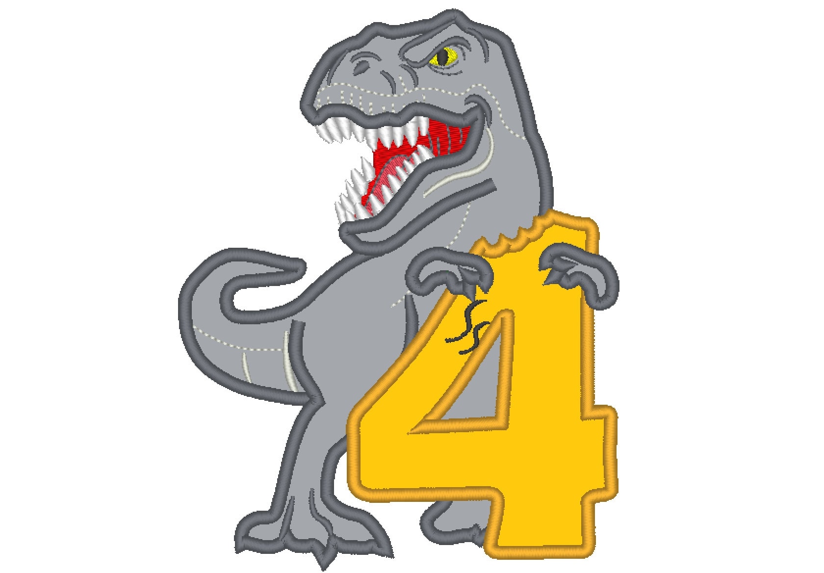 T-rex dinosaur Indominus eating Birthday number four 4 kids boy Birthday outfit machine embroidery designs assorted sizes for hoop 5x7, 6x10