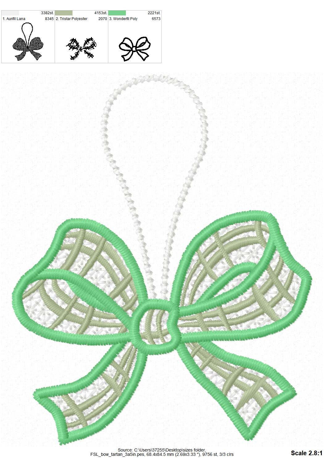 Tartan checked Bow Christmas tree ornament lace FSL Free standing lace machine embroidery designs in the hoop ITH easy & simply gift idea