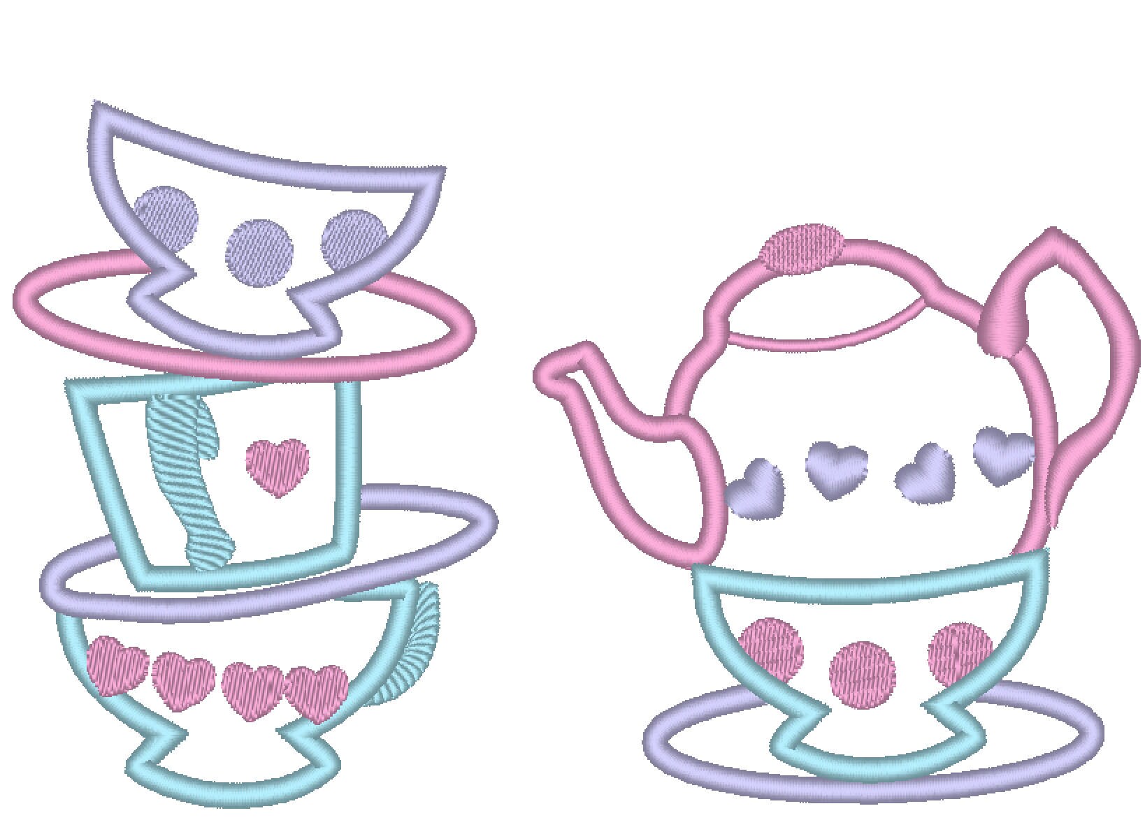Teapot stacked cup Alice birthday party Mad hatter tea party appliqué machine embroidery designs hoop 4x4 5x7 stack of teacup and teapot SIZE for Hoops